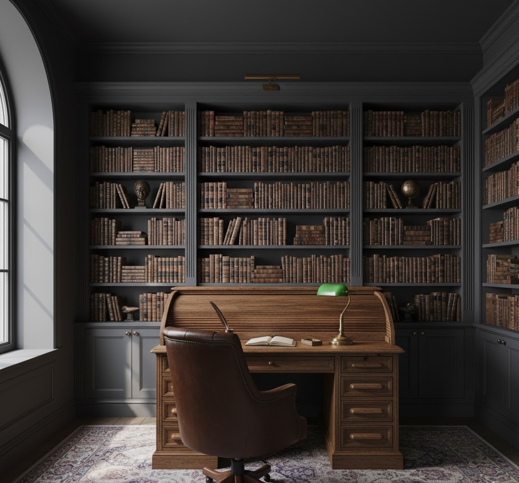 Design a scholarly dark academia retreat, a dedicated sanctuary for profound thought and uninterrupted study. This space is meticulously crafted to foster concentration and intellectual growth, often featuring a secluded corner or a dedicated room. Walls are typically painted in calming, deep tones like charcoal grey, deep forest green, or a rich plum, creating an enveloping atmosphere. A substantial, antique-style desk, perhaps a roll-top or a large partners’ desk, forms the functional heart, surrounded by built-in bookshelves filled with academic texts and research materials. The mood is one of serious contemplation and focused work, with minimal distractions and an emphasis on comfort for long hours. Lighting is crucial, with a powerful, adjustable desk lamp and soft, ambient background lighting. Materials like dark polished wood, worn leather, and heavy, sound-absorbing textiles contribute to a quiet, dignified environment, perfect for deep dives into complex subjects.