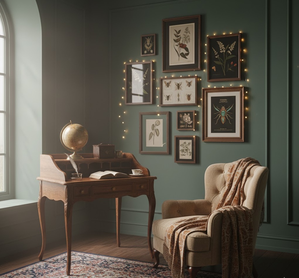 Inject a touch of playful charm into your intellectual space with a whimsical dark academia corner, blending scholarly elements with unexpected, delightful details. This style allows for more personal expression and a lighter touch while retaining the core academic aesthetic. Walls might feature a deep, muted colour, serving as a backdrop for quirky antique finds, framed curiosities, or even a collection of vintage maps. Furniture could include a small, ornate writing desk paired with an unusual vintage chair, or a comfortable armchair adorned with a patterned throw. Functionality is about creating an inviting spot for daydreaming, journaling, or light reading. The mood is one of gentle enchantment and imaginative thought, with lighting often soft and magical, perhaps from fairy lights, a unique table lamp, or a vintage lantern. Materials like dark wood, brass, velvet, and unexpected textiles create a charming, inspiring nook that feels both academic and wonderfully unique.