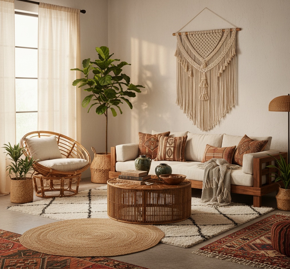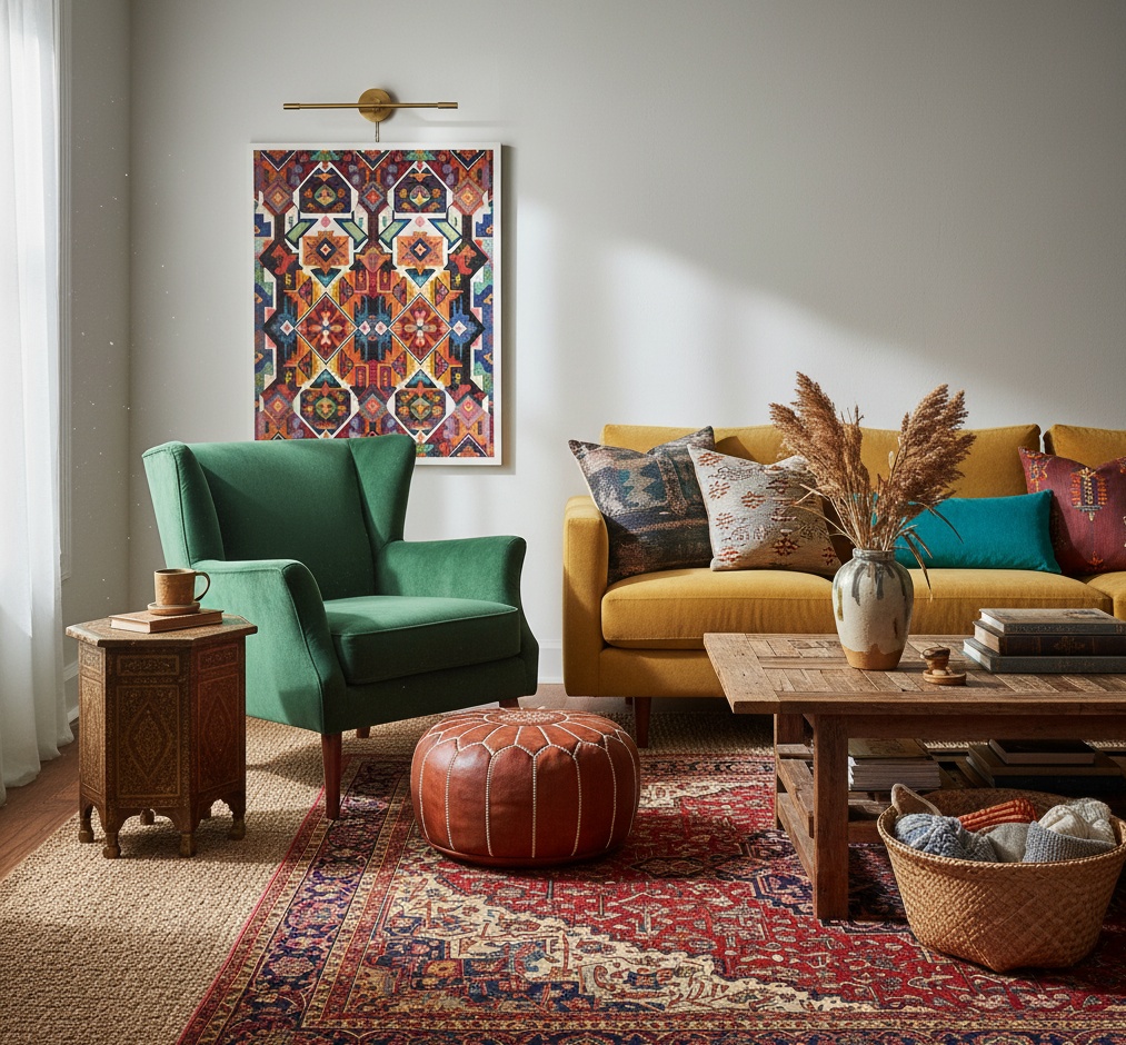Bohemian home decorating embraces a free-spirited, eclectic aesthetic, drawing inspiration from global travels and artistic expression. This style is characterised by a rich tapestry of textures, patterns, and colours, creating a warm and inviting atmosphere that feels lived-in and deeply personal. Materials often include natural fibres like rattan, macramé, jute, and linen, paired with vintage furniture and handcrafted items. The colour scheme is typically earthy and vibrant, featuring deep jewel tones, warm oranges, and lush greens alongside neutral bases. The mood is relaxed, artistic, and unconventional, encouraging comfort and self-expression through a curated collection of unique pieces. Functionality is secondary to comfort and visual appeal, with cosy nooks and layered textiles inviting relaxation and creative contemplation.