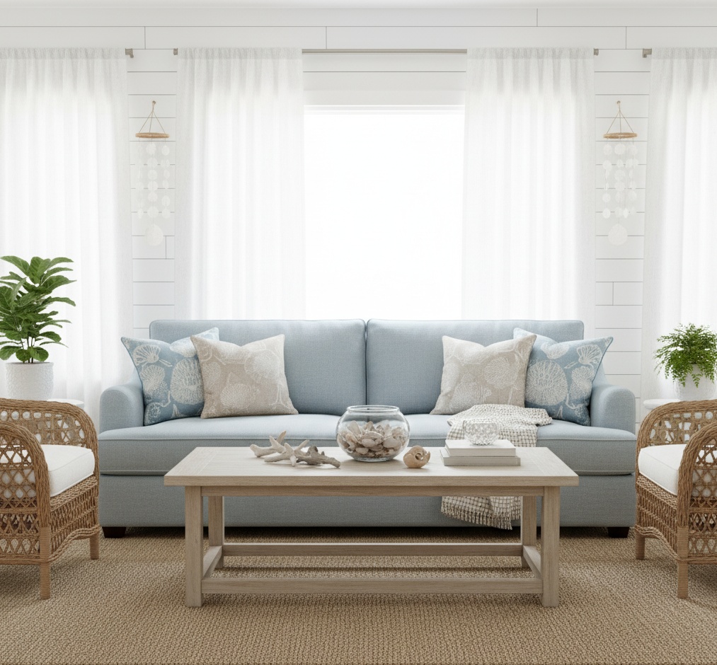 Coastal home decorating evokes the relaxed, breezy atmosphere of seaside living, bringing the tranquility of the ocean indoors. This style is characterised by light, airy spaces and natural elements that reflect beach environments. Materials often include weathered wood, wicker, rattan, linen, and cotton, alongside natural shells and driftwood for decorative touches. The colour palette is dominated by whites, sandy beiges, and various shades of blue and green, mirroring the sea and sky. The mood is fresh, calm, and inviting, creating a serene escape that feels perpetually on holiday. Functionality focuses on comfort and ease, with durable, washable fabrics and open layouts that enhance the feeling of spaciousness, making it a refreshing choice for decorating ideas.