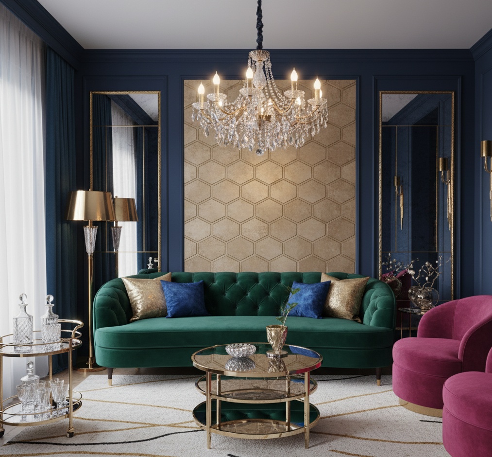 Glam decorating solutions focus on creating a luxurious, opulent, and sophisticated interior with a touch of Hollywood Regency sparkle. This style is characterised by its lavish materials, reflective surfaces, and elegant details. Key materials include velvet, silk, faux fur, mirrored furniture, polished chrome, brass, and crystal. The colour palette often features rich jewel tones like amethyst, sapphire, and emerald, paired with metallics such as gold and silver, and classic neutrals like black and white. The mood is extravagant, chic, and undeniably luxurious, designed to impress and indulge. Functionality is balanced with aesthetics, with comfortable yet stylish furniture and decorative elements that elevate the space, offering truly dazzling decorating ideas.