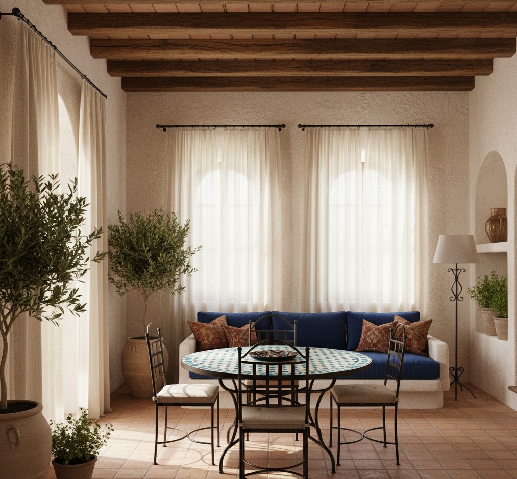Mediterranean decorating vibes transport you to the sun-drenched coasts of Southern Europe, characterised by earthy textures, vibrant colours, and a relaxed, rustic elegance. This style celebrates natural light, outdoor living, and a connection to the sea and land. Materials often include terracotta, wrought iron, mosaic tiles, stucco, and natural woods, alongside linen and cotton fabrics. The colour palette features warm, sun-baked tones like terracotta, ochre, deep blues, olive greens, and crisp whites, reflecting the regional landscape. The mood is warm, inviting, and leisurely, fostering a sense of hospitality and escape. Functionality focuses on durability and comfort, with robust furniture and cool, breathable materials, making it a charming choice for decorating ideas that evoke a holiday feel.
