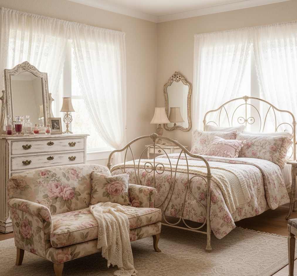 Shabby Chic decorating embraces a soft, romantic, and vintage-inspired aesthetic, characterised by distressed finishes, pastel colours, and a comfortable, lived-in feel. This style celebrates imperfections and the beauty of aged items, creating a charming and nostalgic atmosphere. Materials often include painted and distressed wood, wrought iron, linen, cotton, and lace, with an abundance of floral patterns. The colour palette is dominated by soft pastels like dusty pinks, mint greens, pale blues, and creamy whites, creating a gentle and airy feel. The mood is cosy, feminine, and whimsical, evoking a sense of old-world charm and relaxed elegance. Functionality prioritises comfort and visual appeal, with antique or vintage-inspired pieces adding character, making it a delightful choice for decorating ideas.