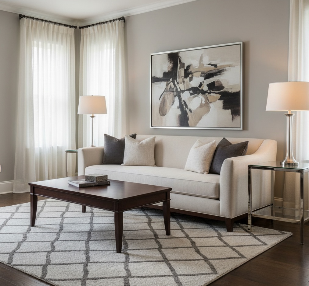Transitional decorating styles expertly blend elements of traditional and modern design, creating a sophisticated and timeless aesthetic that is neither too formal nor too stark. This style is characterised by its harmonious balance, clean lines, and comfortable elegance. Materials often include polished wood, upholstered furniture in neutral fabrics, glass, and metal, combining classic forms with contemporary finishes. The colour palette typically features a sophisticated range of neutrals like creams, greys, taupes, and whites, often accented with subtle blues or greens for a touch of colour. The mood is refined, comfortable, and inviting, offering a sense of understated luxury. Functionality is key, with practical yet stylish furnishings that adapt to various tastes, making it a versatile choice for decorating ideas.