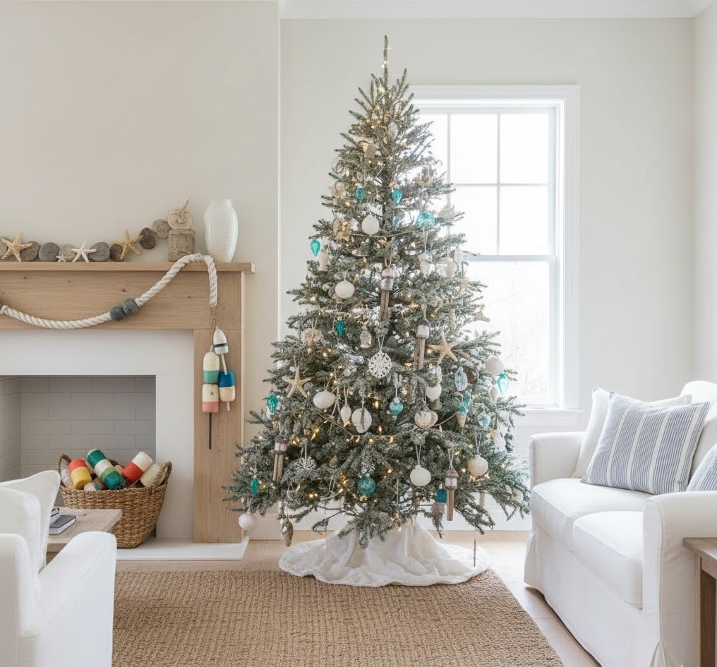 Bring the refreshing calm of the seaside indoors with coastal diy christmas style, offering a unique and serene festive aesthetic. This distinctive style incorporates natural elements found by the ocean, such as seashells, driftwood, sand, and sea glass, often paired with nautical ropes and light fabrics. Colours are a soothing palette of ocean blues, sandy beiges, crisp whites, and soft greens, creating a tranquil, airy, and refreshing holiday atmosphere. Functionality is often seen in repurposed items like driftwood garlands or shell-adorned wreaths, which bring a touch of the beach to your festive decor. The overall mood is one of peaceful relaxation and natural beauty, transforming your home into a serene coastal retreat even during the winter months, perfect for those who dream of a beach-inspired Christmas.