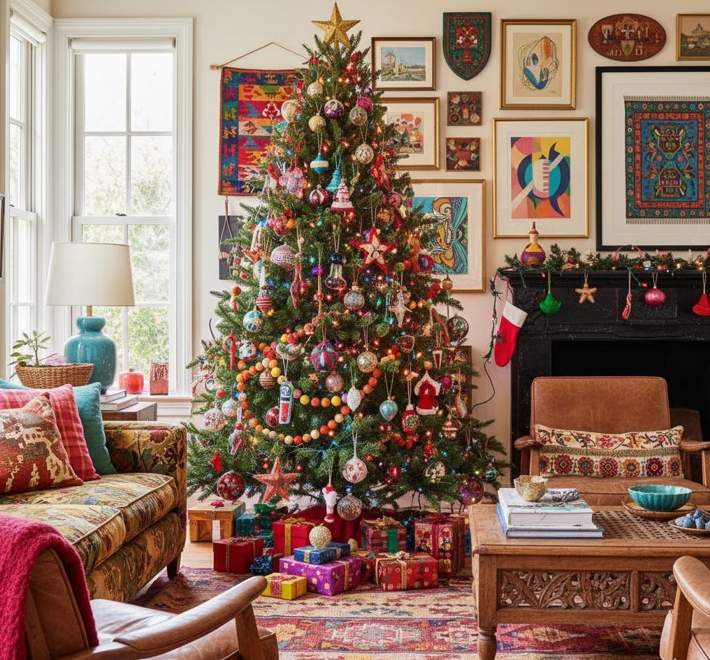 Express your unique personality with eclectic diy christmas style, creating a vibrant and wonderfully unconventional festive interior. This bold style embraces a mix-and-match approach, combining elements from various aesthetics, cultures, and eras, utilising materials like colourful fabrics, vintage finds, global textiles, and personal mementos. Colours are a dynamic and often unexpected blend, ranging from bright jewel tones to muted pastels, creating an energetic, personalised, and truly one-of-a-kind atmosphere. Functionality is about showcasing individuality, with decorations like a gallery wall of mixed ornaments or a tree adorned with travel souvenirs and handcrafted curiosities. The overall mood is one of joyful self-expression and creative freedom, transforming your space into a vibrant tapestry of festive stories, perfect for a Christmas that is as unique as you are.