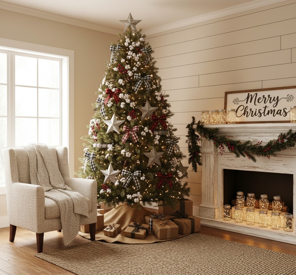 Cultivate a charming and inviting atmosphere with farmhouse diy christmas decor, blending rustic simplicity with cosy elegance. This popular style features natural textures and handcrafted elements, utilising materials like distressed wood, galvanised metal, buffalo check fabric, and cotton. Colours are typically a comforting palette of crisp whites, soft greys, natural wood tones, and classic black and red accents, creating a warm, welcoming, and effortlessly stylish festive interior. Functionality is often practical and decorative, with items like wooden signs, mason jar luminaries, or fabric advent calendars serving a purpose while enhancing the aesthetic. The overall mood is one of relaxed comfort and homely charm, transforming your space into a picturesque farmhouse retreat, perfect for a Christmas that feels both authentic and beautifully curated.