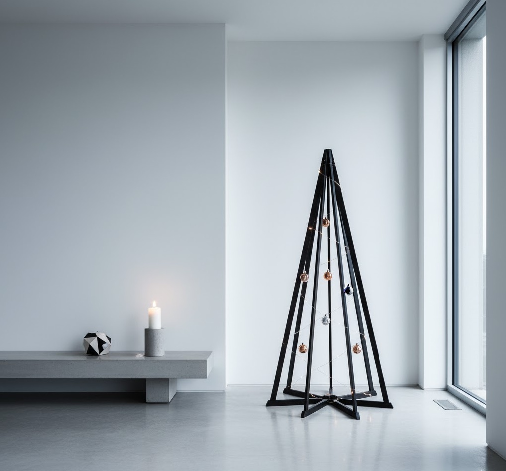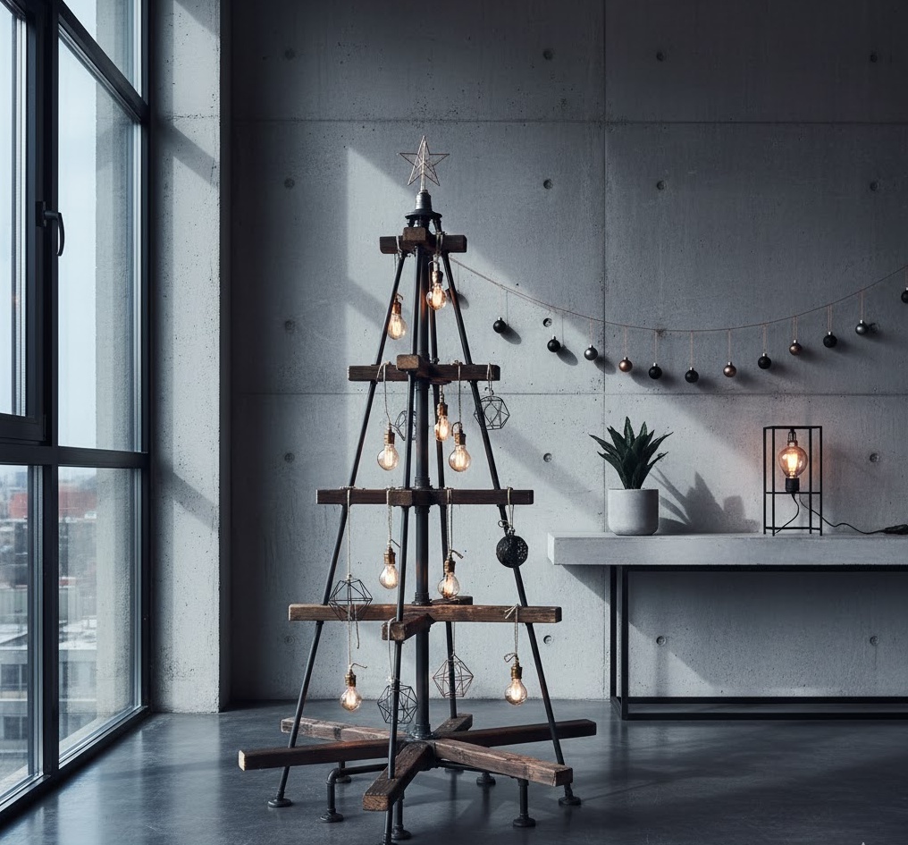 Introduce an edgy, urban vibe with industrial diy christmas decor, creating a distinctive and contemporary festive interior. This bold style embraces raw materials and utilitarian aesthetics, utilising elements like exposed metal, concrete, reclaimed wood, Edison bulbs, and simple geometric forms. Colours are typically a strong, monochromatic palette of black, grey, white, and natural wood tones, often accented with metallic copper or brass, creating a sophisticated, robust, and modern atmosphere. Functionality is often about repurposing industrial elements, such as pipe-fitting candle holders or wire-cage ornaments, which add a unique, raw charm. The overall mood is one of urban cool and understated strength, transforming your space into a chic, loft-inspired holiday setting, perfect for a Christmas that feels both innovative and effortlessly stylish.