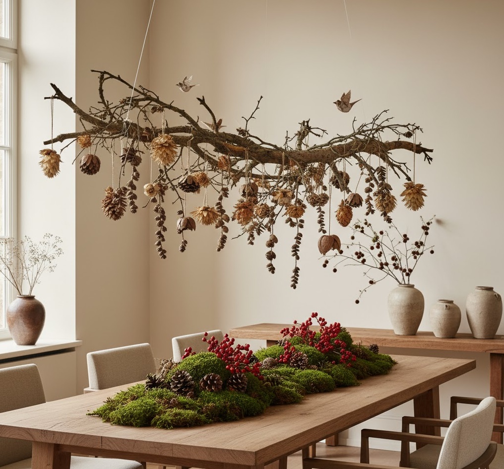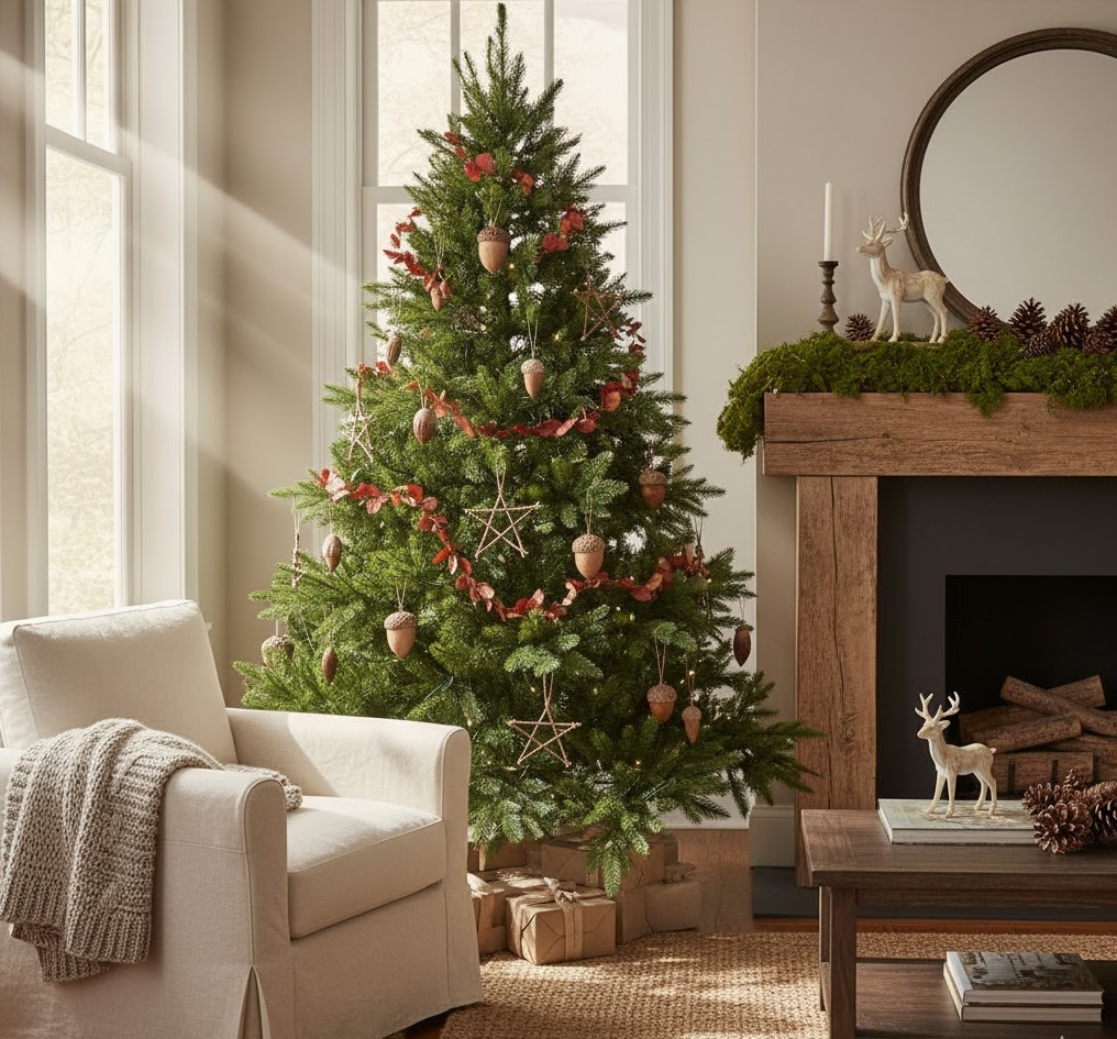 Bring the enchanting magic of the forest indoors with woodland diy festive decor, creating a captivating and natural holiday setting. This organic style celebrates the beauty of the wilderness, utilising materials like moss, twigs, acorns, dried leaves, and feathers, often combined with earthy twine or burlap. Colours are a rich tapestry of deep greens, bark browns, muted golds, and touches of cranberry red, creating a mysterious, cosy, and wonderfully immersive atmosphere. Functionality is often about creating miniature natural scenes or adding organic texture, such as a moss-covered centrepiece or garlands made from intertwined twigs. The overall mood is one of serene enchantment and rustic elegance, transforming your space into a magical forest glade, perfect for a Christmas that feels deeply connected to nature’s quiet beauty.