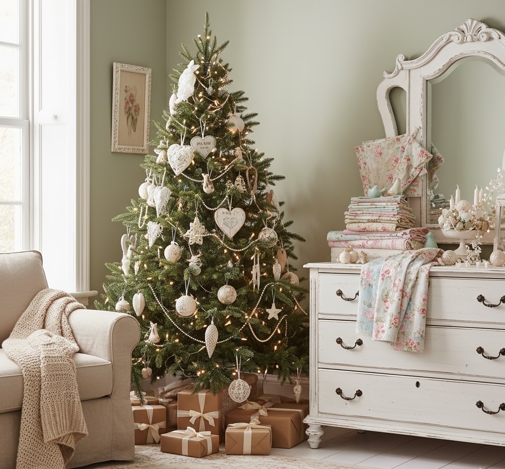 Infuse your home with romantic charm using shabby chic diy christmas decorations, creating a soft, elegant, and wonderfully inviting festive space. This delicate style celebrates distressed finishes, vintage-inspired details, and a gentle, feminine aesthetic, utilising materials like lace, burlap, distressed wood, pearls, and soft fabrics. Colours are typically a dreamy palette of muted pastels – dusty pinks, pale blues, creamy whites, and soft greys – creating a serene, romantic, and wonderfully nostalgic atmosphere. Functionality is often about creating a sense of gentle beauty, with decorations like lace-trimmed stockings, distressed wooden signs, or pearl-adorned baubles adding a touch of faded grandeur. The overall mood is one of tender elegance and comforting nostalgia, transforming your space into a charming, vintage-inspired haven, perfect for a Christmas filled with delicate beauty.