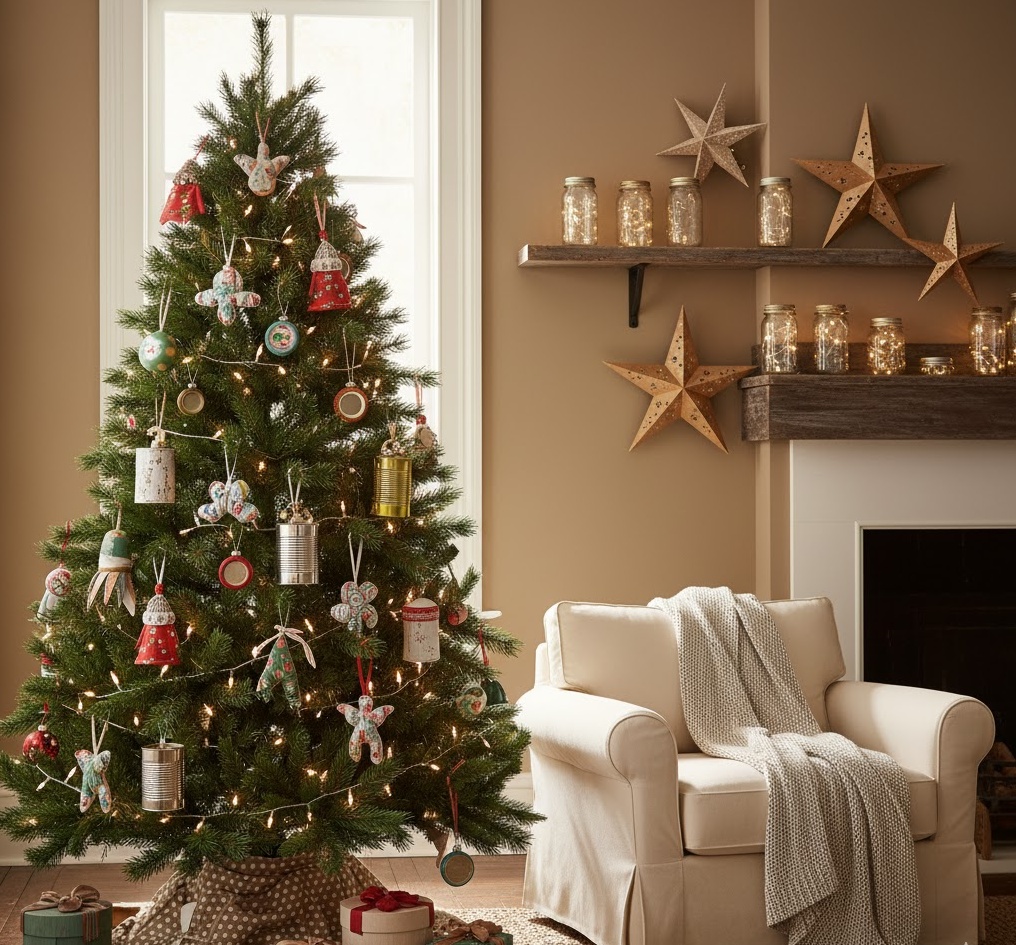 Embrace sustainability and creativity with upcycled diy christmas decor, transforming forgotten items into unique festive treasures. This eco-conscious style champions resourcefulness, utilising materials like old jars, tin cans, fabric scraps, cardboard, and plastic bottles, giving them a new lease of life. Colours can be a diverse mix, often dictated by the original materials, but frequently leaning towards natural tones or vibrant, painted finishes, creating an eclectic and surprisingly stylish atmosphere. Functionality is inherent in the act of repurposing, with decorations like tin can lanterns, fabric scrap garlands, or bottle cap ornaments serving as both decor and a statement of environmental care. The overall mood is one of ingenious creativity and mindful celebration, transforming your home into a showcase of sustainable festive artistry, perfect for an environmentally friendly Christmas.