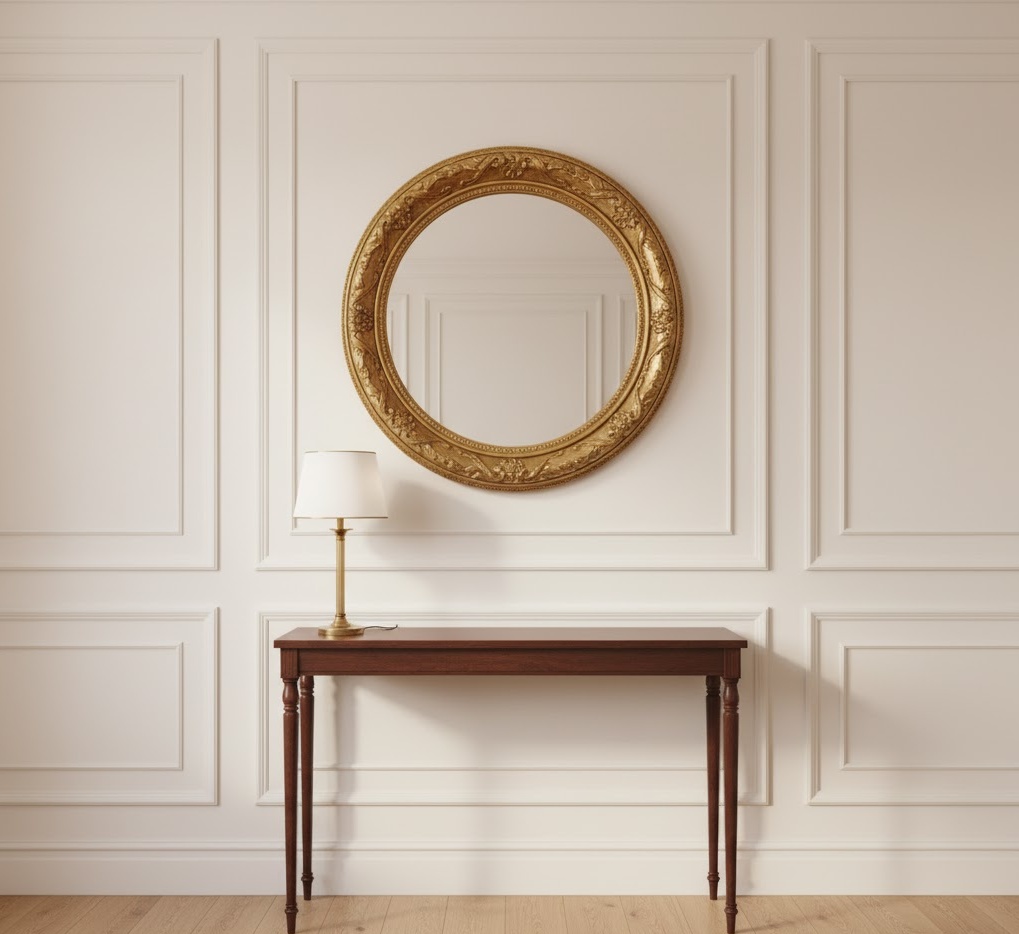 A classic elegant small entryway exudes timeless sophistication, even in a compact space. This style often features decorative wall mouldings, polished dark wood furniture, and subtle brass or gold accents. A sophisticated colour palette of muted tones like cream, sage green, or deep navy creates a refined and luxurious mood. A slim console table, perhaps with delicate legs, paired with an ornate mirror, forms a focal point without cluttering the area. Functionality is discreetly handled with elegant hooks or a small, upholstered stool. The overall impression is one of understated luxury and enduring style.