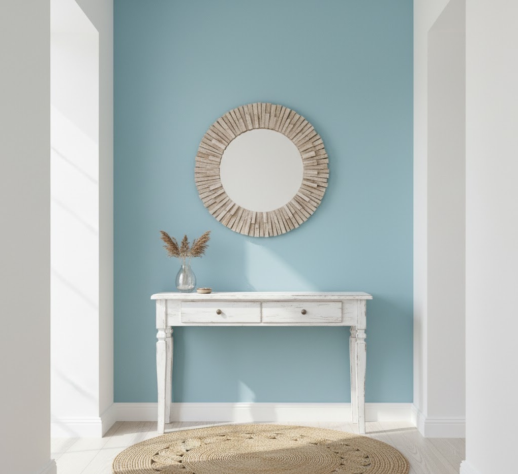 Bring the serene, breezy feel of the seaside into your small entryway with a coastal design. A palette of whites, sandy beiges, and various shades of light blue or seafoam green instantly evokes a tranquil atmosphere. Natural fibres like jute, linen, and cotton are prominent in rugs, upholstery, or decorative accents. Driftwood, shells, or nautical-inspired decor can be subtly incorporated without overwhelming the compact space. Functionality is light and airy, perhaps a slim white console table or a simple set of hooks. The mood is fresh, relaxed, and effortlessly chic, making your entryway a breath of fresh air.