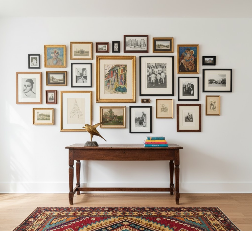 An eclectic small entryway celebrates individuality and a curated mix of styles, periods, and textures. This approach allows for bold patterns, vibrant colours, and a collection of vintage finds or personal treasures. The key is thoughtful curation to avoid clutter, even with diverse elements. A colourful patterned rug can anchor the space, while a gallery wall featuring varied art and photographs adds personality. Functionality is achieved through a mix of storage pieces, perhaps a vintage console table alongside modern hooks. The mood is vibrant, unique, and expressive, making a memorable first impression.