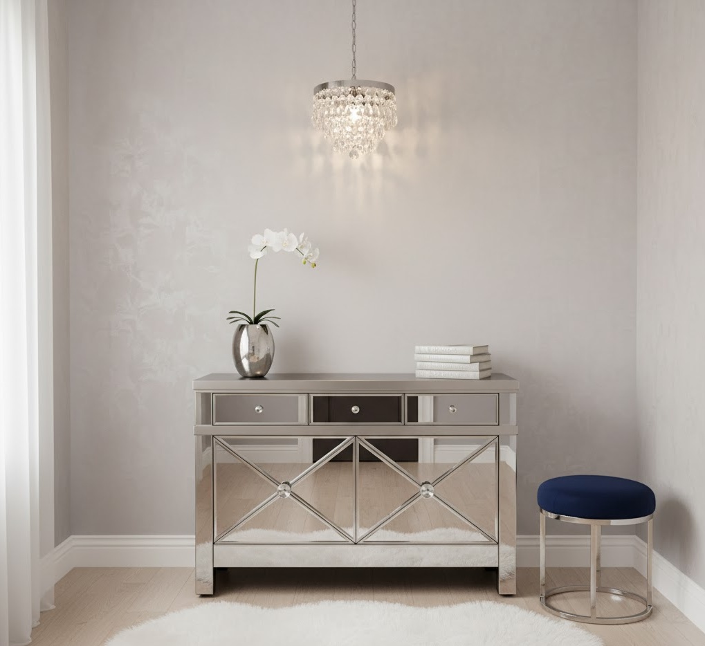 Create a dazzling first impression with a glamorous small entryway design, focusing on luxurious materials and opulent details. Mirrored furniture, such as a slim console table, instantly adds sparkle and helps to visually expand the space. Crystal accents, plush fabrics like velvet or faux fur, and metallic finishes in silver or gold are essential. A small chandelier or elegant wall sconces provide sophisticated lighting. The colour palette often includes rich jewel tones, deep greys, or classic black and white. The mood is one of luxury and extravagance, making even a compact entryway feel grand and inviting.