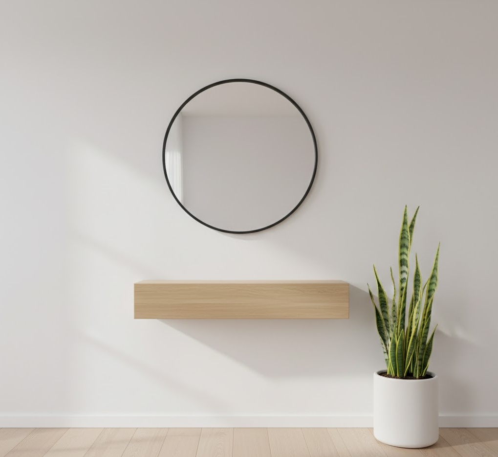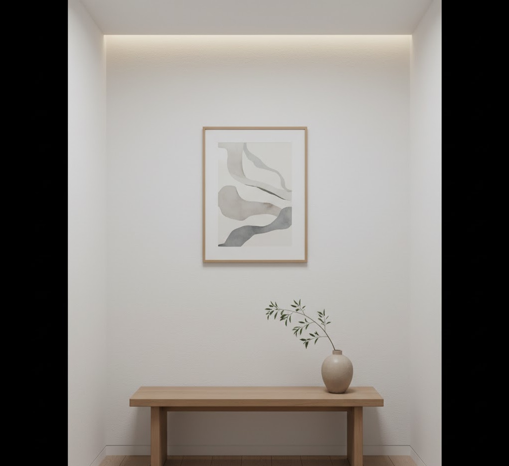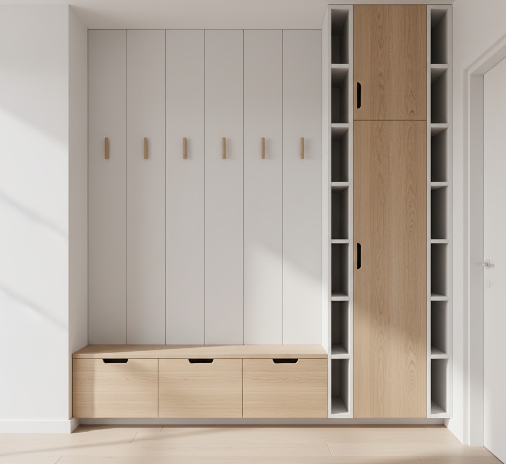 Japandi style, a harmonious blend of Japanese minimalism and Scandinavian warmth, is perfect for small entryway solutions. It emphasises clean lines, natural materials like light oak or ash wood, and a muted colour palette of whites, greys, and soft earthy tones. Functionality is paramount, with simple, uncluttered furniture such as a low wooden bench or floating shelves. Ceramic vases, subtle wall art, and carefully chosen plants add a touch of nature and serenity without overwhelming the space. The mood is tranquil, balanced, and highly functional, creating a peaceful transition into the home.