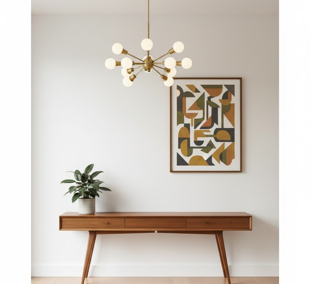 A Mid-Century Modern small entryway brings a touch of retro style and optimistic design to your home. Key materials include teak or walnut wood, characterised by clean lines and tapered legs on furniture. A neutral backdrop can be enlivened with vibrant accent colours like orange, teal, or mustard yellow in artwork or a small accessory. A Sputnik light fixture or a simple, geometric mirror can serve as iconic design elements. Functionality is sleek and unobtrusive, with slim console tables and wall-mounted coat racks. The mood is stylish, sophisticated, and effortlessly cool, reflecting the era’s forward-thinking aesthetic.
