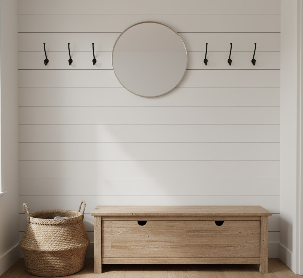 A modern farmhouse small entryway blends rustic charm with contemporary elegance, creating a warm and inviting first impression. Shiplap walls, painted in crisp white or a soft neutral, are a hallmark of this style, providing texture and character. Distressed or reclaimed wood furniture, such as a small bench with storage, pairs beautifully with black metal accents found in hooks, lighting, or mirror frames. A neutral colour palette, often with muted greens or blues, enhances the cosy yet refined mood. Functionality is key, with practical storage solutions seamlessly integrated into the design, offering both style and utility.