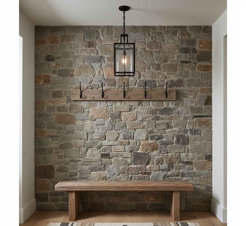 Embrace the warmth and authenticity of rustic charm in your small entryway, creating a welcoming and grounded atmosphere. Reclaimed wood is a key material, used for benches, console tables, or even as an accent wall. Natural stone elements, wrought iron details, and warm earthy tones like terracotta, olive green, and deep browns define the colour palette. Handmade textiles, such as a chunky knit throw or a woven rug, add texture and cosiness. Functionality is robust and straightforward, with sturdy hooks and baskets for practical storage. The mood is inviting, natural, and full of character, reminiscent of a countryside retreat.