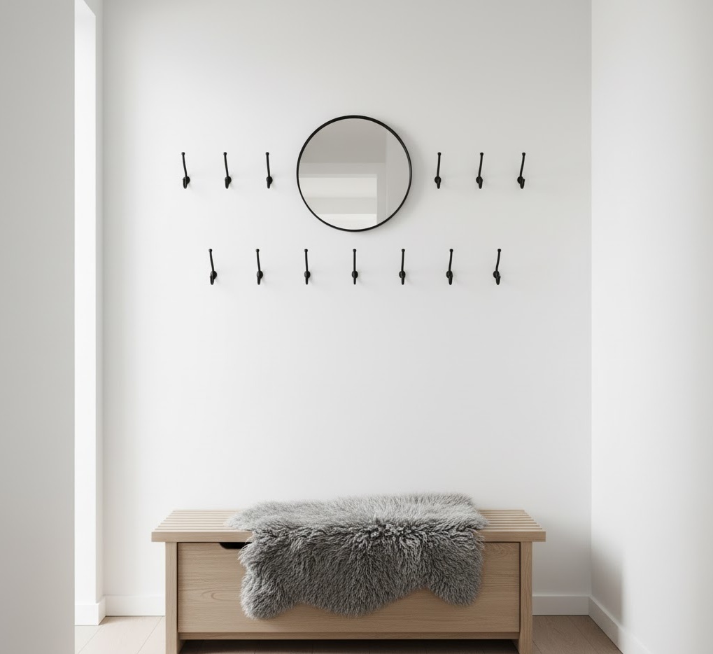 Scandinavian design for a small entryway prioritises functionality, simplicity, and a bright, airy atmosphere. Light-coloured woods, such as birch or ash, are central, often paired with crisp white walls to maximise natural light and create a sense of spaciousness. Furniture is typically streamlined and practical, like a slim bench with integrated storage or a minimalist wall-mounted coat rack. Soft textiles, perhaps a sheepskin throw or a simple woven rug, introduce a touch of “hygge” – cosiness and comfort. The mood is serene and welcoming, focusing on natural elements and an uncluttered aesthetic to make the most of limited space.
