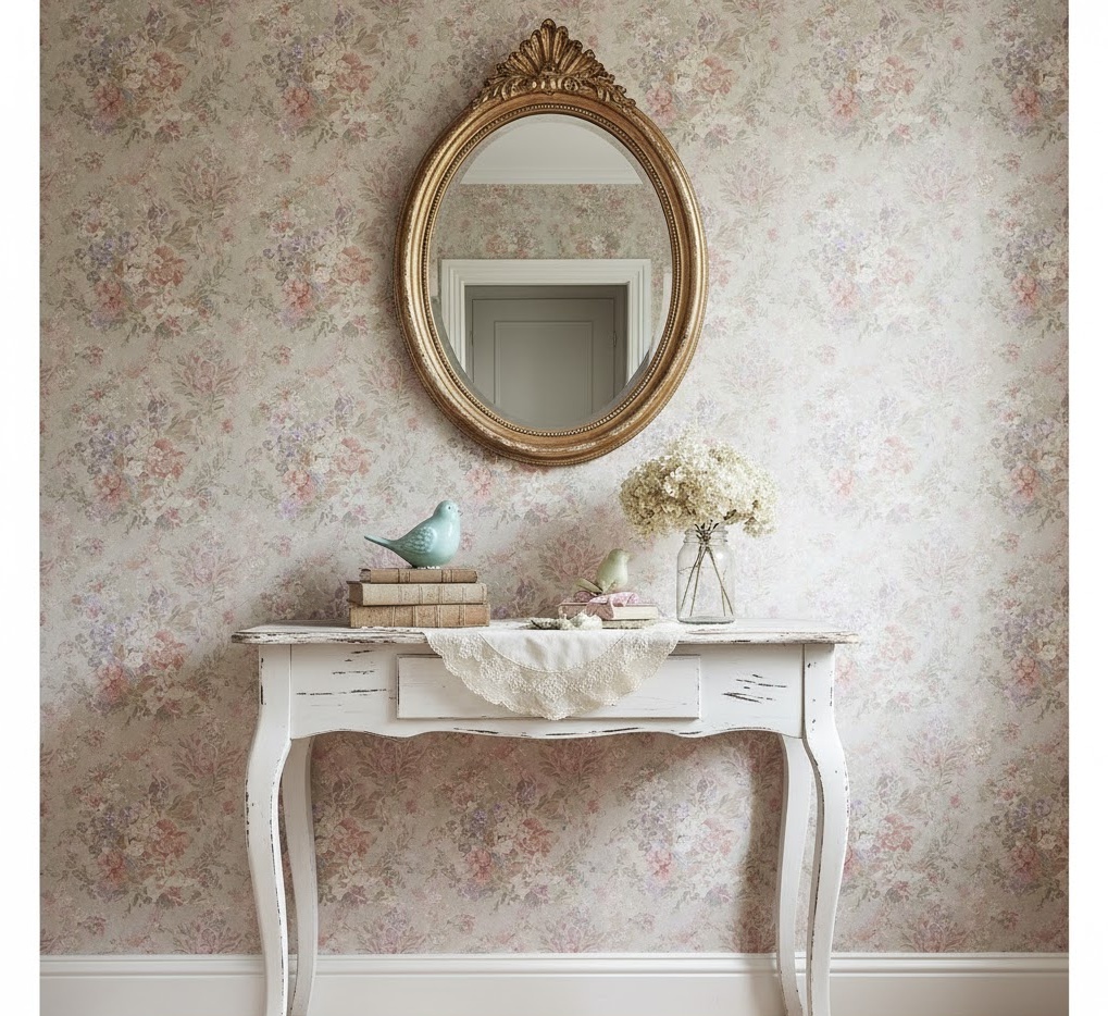 A shabby chic small entryway offers a romantic, soft, and nostalgic welcome to your home. This style is characterised by distressed or antique-look furniture, often painted in pastel colours like mint green, rose pink, or creamy white. Floral patterns, vintage lace details, and charming antique finds contribute to the whimsical mood. A delicate, perhaps slightly worn, console table paired with a vintage mirror creates a focal point. Functionality is gentle, with decorative hooks and small, pretty baskets for storage. The overall aesthetic is one of comfortable elegance and timeless, feminine charm.