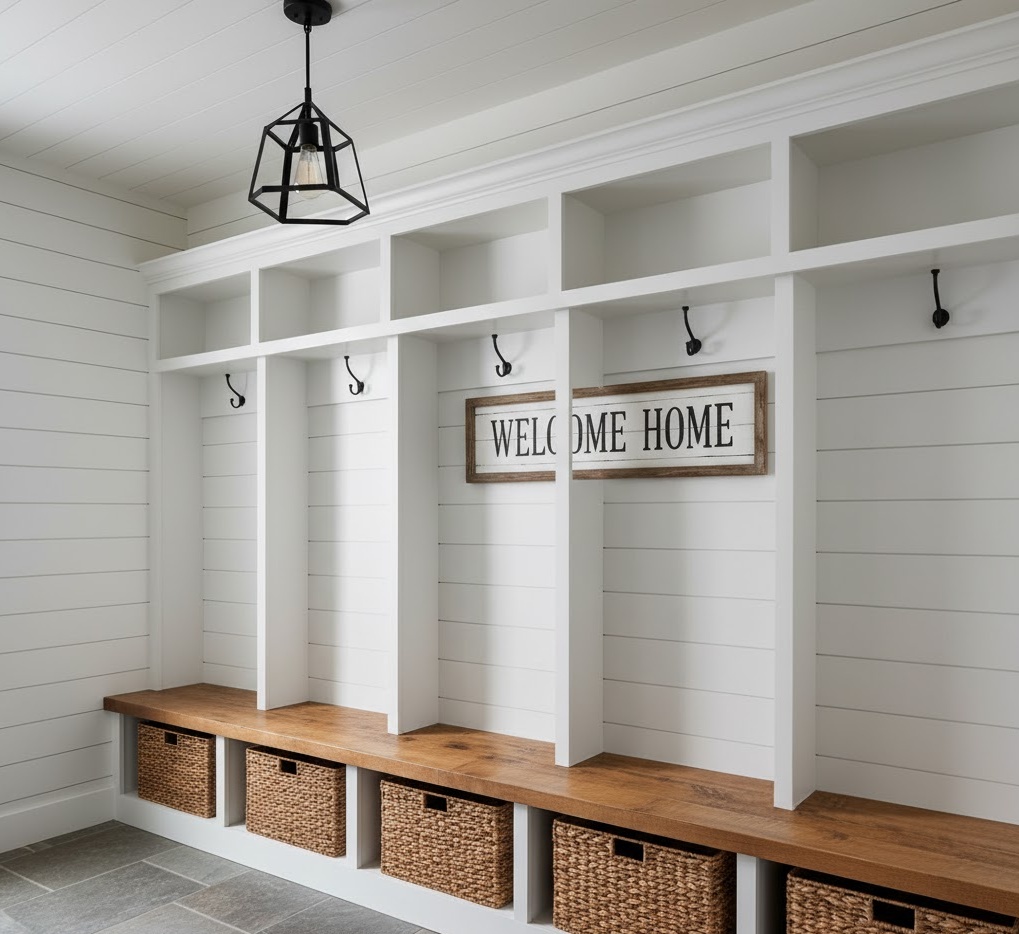 Farmhouse mudroom storage combines rustic charm with practical, family-friendly functionality, creating a hardworking yet inviting space. This style often features shiplap walls, distressed white or natural wood finishes, and sturdy, practical furniture. Built-in cubbies, open shelving, and robust hooks are essential for organising coats, boots, and bags, often paired with woven or metal baskets. The colour palette is typically light and airy, with whites, creams, and soft greys, fostering a clean and welcoming mood. It’s about creating an organised, durable, and charming entrance that can handle daily family life with ease.