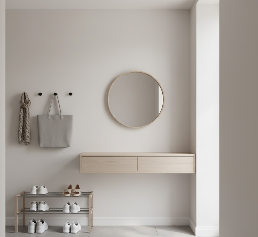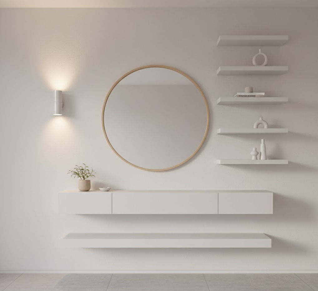 Floating entryway shelves offer a light, airy, and contemporary storage solution that keeps your floor space clear and uncluttered. This style features shelves mounted directly to the wall without visible supports, creating a sleek and minimalist aesthetic. Materials can range from solid wood for warmth to glass or metal for a more modern edge, often in neutral colours to blend seamlessly. The mood is one of understated elegance and spaciousness, perfect for displaying decorative items or holding small essentials without visual bulk. They are ideal for adding functional storage while maintaining an open, expansive feel.