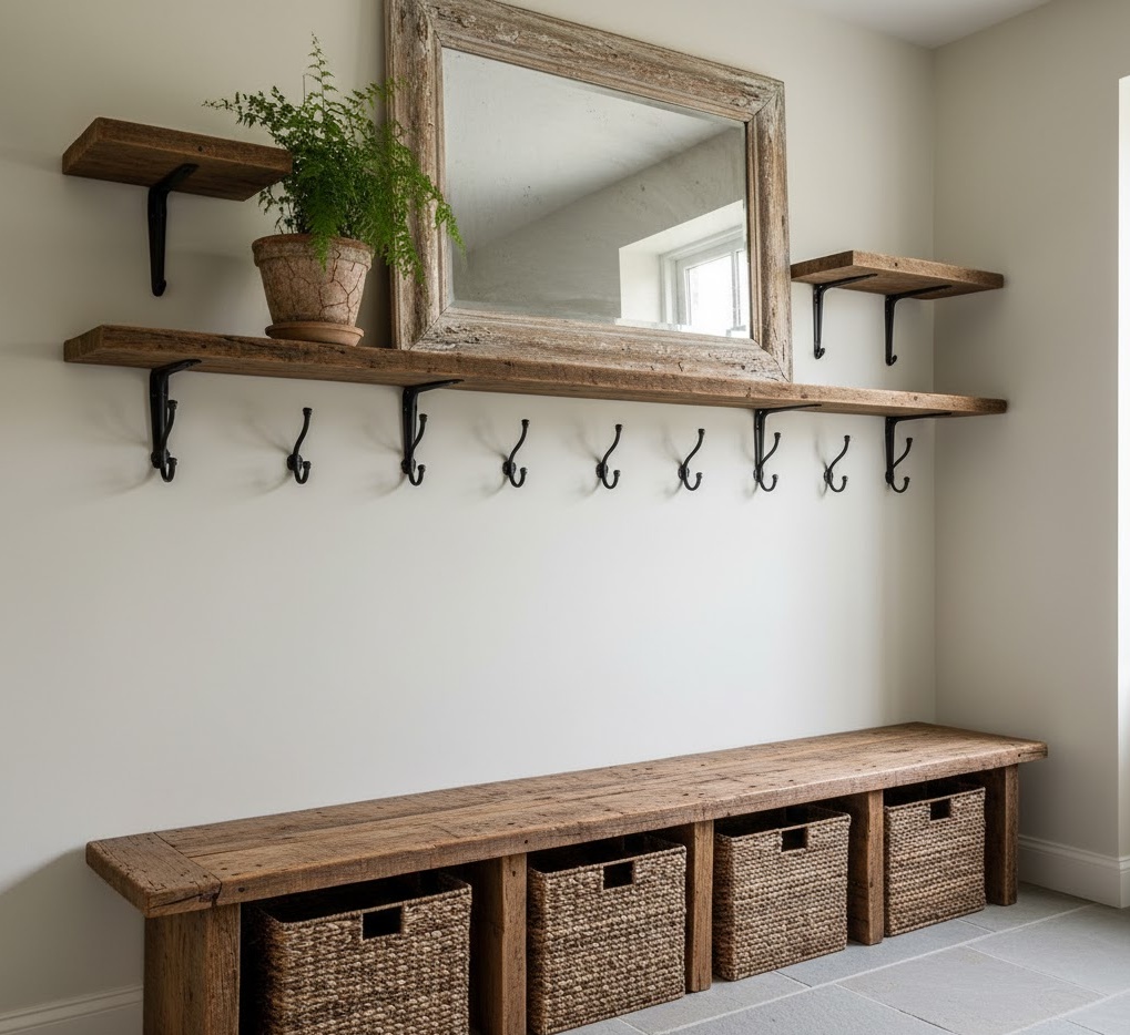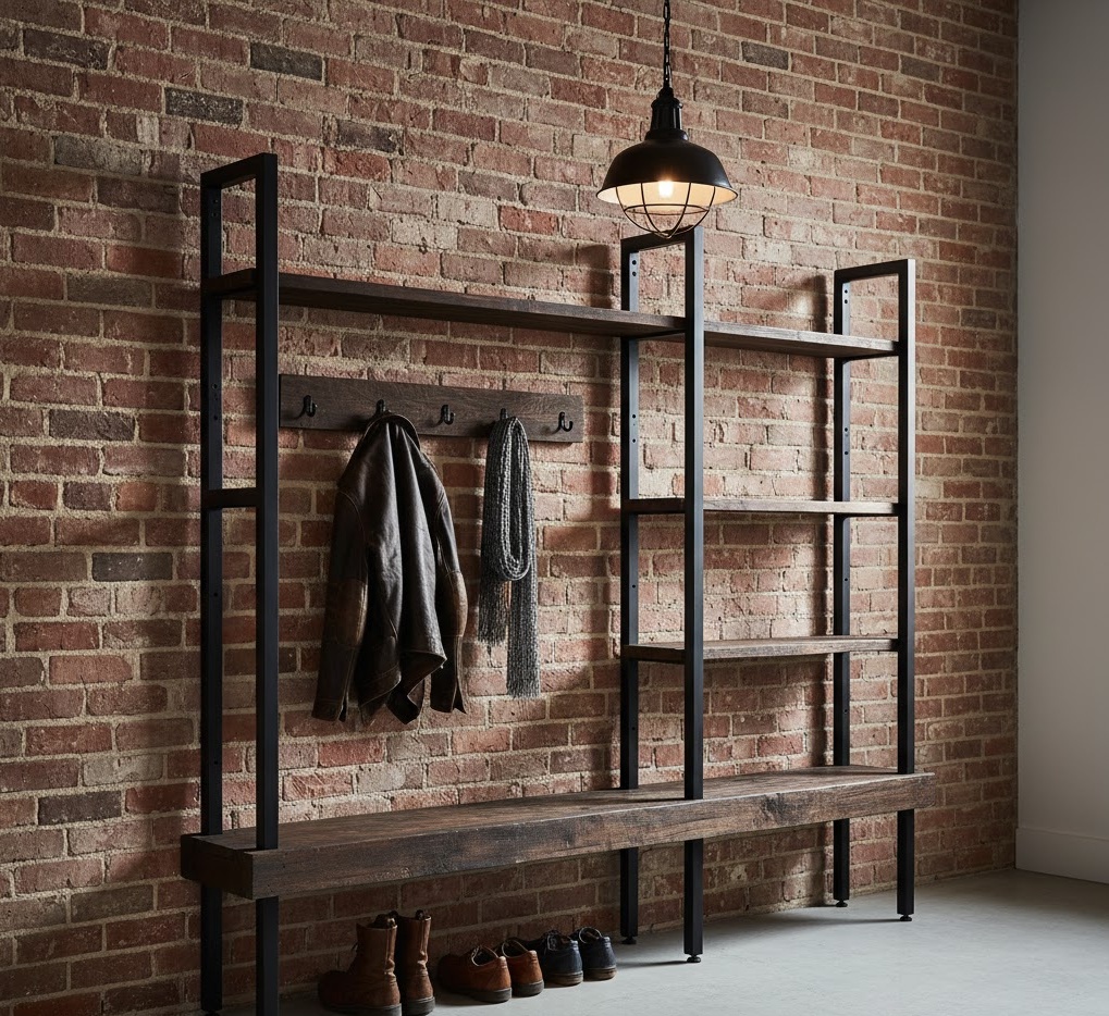 Industrial entryway organisers celebrate raw, utilitarian aesthetics, bringing an edgy, urban vibe to your home’s entrance. This style features exposed materials like brick, concrete, and unpolished metals such as steel and iron, often combined with dark, reclaimed wood. Open shelving, locker-style cabinets, and heavy-duty hooks are typical, providing robust and practical storage solutions. The colour palette leans towards greys, blacks, and deep browns, creating a strong, no-nonsense mood. It’s about showcasing the structure and functionality, offering durable and stylish organisation for a truly distinctive entryway.