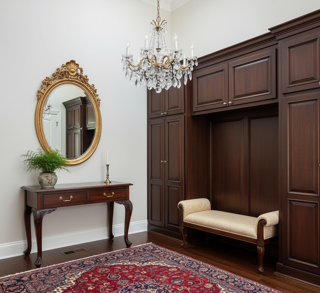 Elegant foyer storage creates a luxurious and refined first impression, setting a sophisticated tone for the entire home. This style often features high-quality materials like polished marble, rich dark woods, and exquisite metallic accents such as brass or chrome. Grand console tables, ornate mirrors, and bespoke cabinetry with intricate detailing are common, providing both beauty and discreet storage. The colour palette typically includes deep, muted tones or classic neutrals, fostering an atmosphere of understated opulence. It’s about combining practical organisation with timeless beauty, ensuring your foyer is both functional and breathtakingly chic.