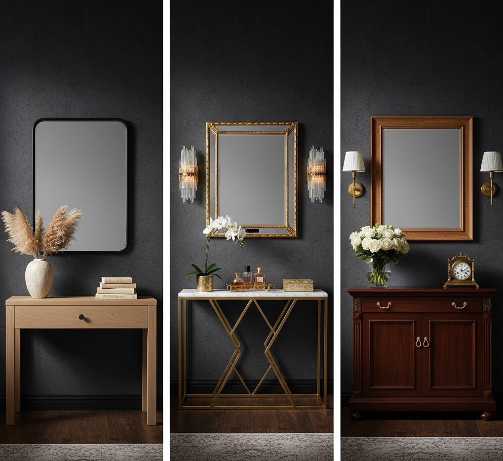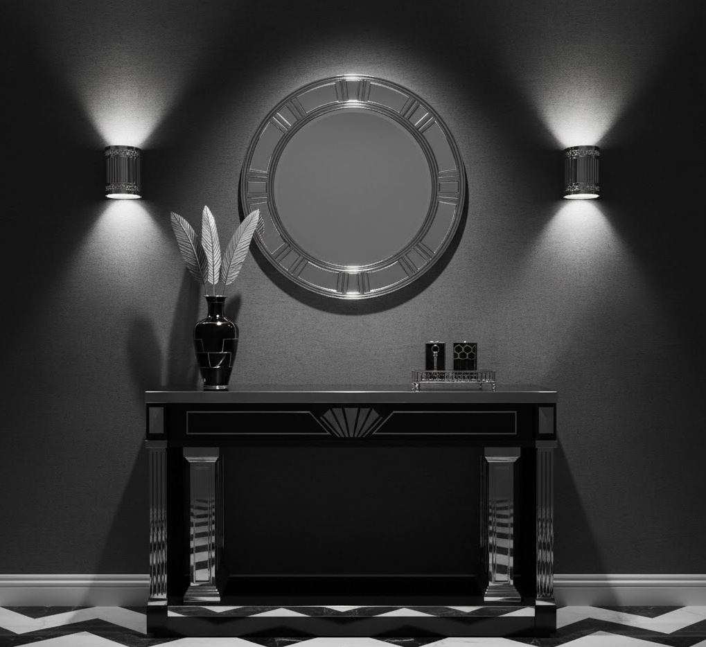 An Art Deco entryway table makes a glamorous and sophisticated statement, instantly transporting your entrance to the opulent era of the 1920s and 30s. This distinctive style is characterised by its bold geometric patterns, luxurious materials, and a sense of dramatic flair. Typically crafted from exotic woods, polished chrome, mirrored surfaces, or black lacquer, these tables often feature striking symmetrical designs and intricate inlays. The colour palette is rich and dramatic, incorporating deep blacks, gleaming golds, silvers, and jewel tones, creating an atmosphere of lavish elegance. Functionality is often secondary to form, with the table itself serving as a sculptural piece, though some may offer discreet storage. The mood is one of sophisticated luxury and theatrical grandeur, making this entryway table idea perfect for those who desire a truly show-stopping and historically chic first impression.