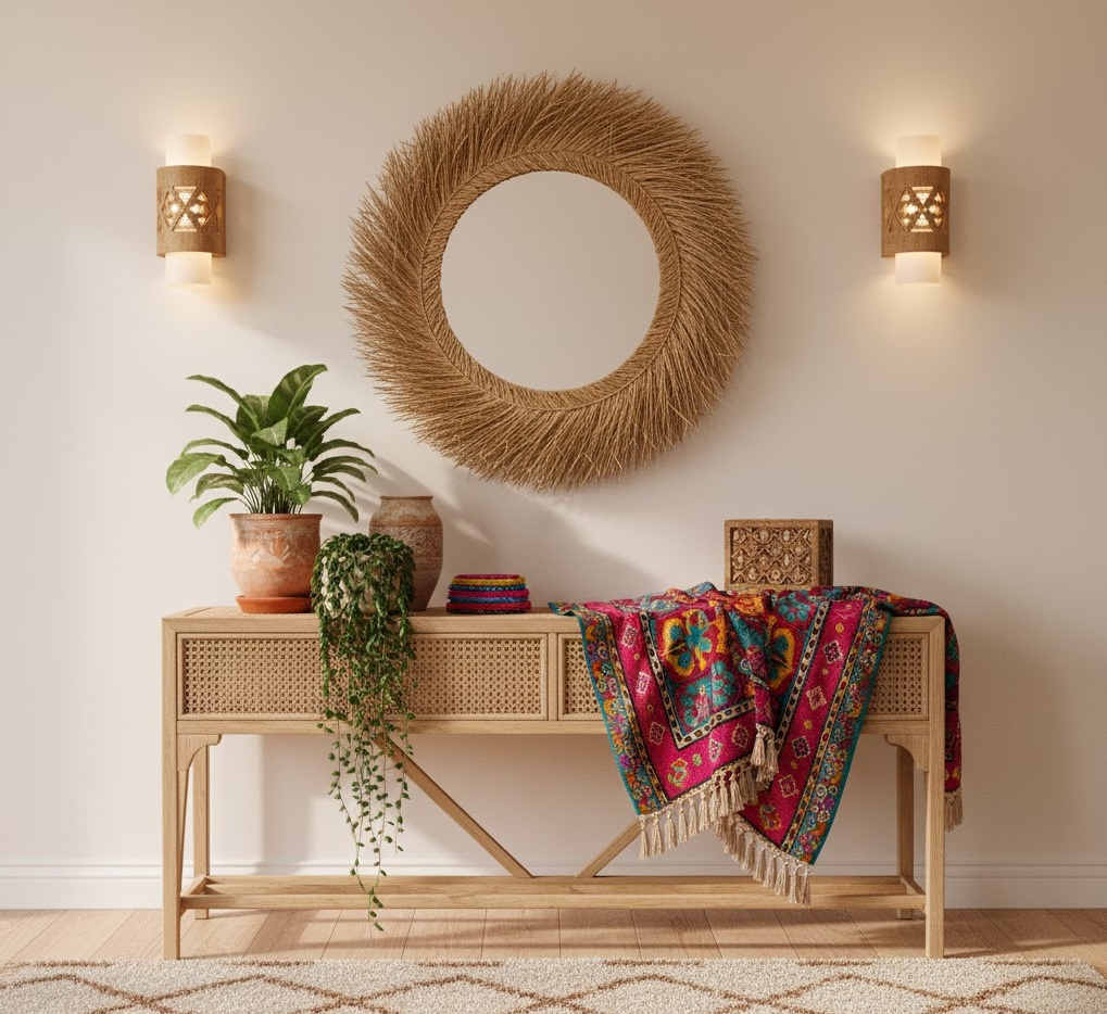 A bohemian chic entryway table infuses your home’s entrance with a free-spirited, eclectic, and globally inspired charm, creating an immediate sense of warmth and personality. This style embraces a rich tapestry of textures, patterns, and natural elements, fostering a relaxed and inviting atmosphere. Typically crafted from natural woods, rattan, or bamboo, these tables often feature intricate carvings or woven details, complemented by a vibrant colour palette of earthy tones, jewel hues, and natural whites. Functionality is often casual, with space for displaying treasured travel finds, potted plants, or colourful textiles, encouraging a sense of wanderlust. The mood is artistic, unconventional, and deeply personal, making this entryway table idea perfect for those who love to express their individuality and create a welcoming, well-travelled aesthetic right from the doorstep.