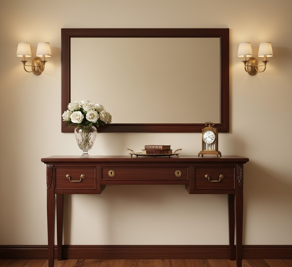 A classic traditional entryway table exudes timeless elegance and refined sophistication, offering a grand and formal welcome to any home. This style is characterised by its rich details, ornate craftsmanship, and a sense of enduring heritage. Typically crafted from dark, polished woods like mahogany or cherry, these tables often feature intricate carvings, turned legs, or elegant brass hardware, showcasing superior artistry. The colour palette leans towards deep, warm tones, often complemented by rich fabrics or antique accents, creating a luxurious and established mood. Functionality often includes ample drawer space for discreet storage, maintaining a polished and organised appearance. The overall mood is one of dignified charm and stately grace, making this entryway table idea perfect for those who appreciate historical beauty and a truly distinguished first impression.