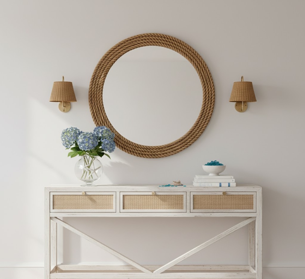A coastal inspired entryway table brings the refreshing serenity of the seaside into your home, creating a light, airy, and relaxed welcome. This style is defined by its natural textures, soothing colours, and a breezy, effortless aesthetic reminiscent of beach houses. Typically crafted from light-coloured or whitewashed woods, rattan, or woven materials, these tables often feature a relaxed, slightly weathered finish. The colour palette is dominated by whites, blues, and sandy neutrals, evoking the calming hues of the ocean and sky, fostering a tranquil mood. Functionality often includes open shelving for displaying shells, driftwood, or nautical decor, enhancing the thematic appeal. The overall mood is one of peaceful escape and casual elegance, making this entryway table idea perfect for those who wish to infuse their entrance with a perpetual holiday feel and a breath of fresh air.
