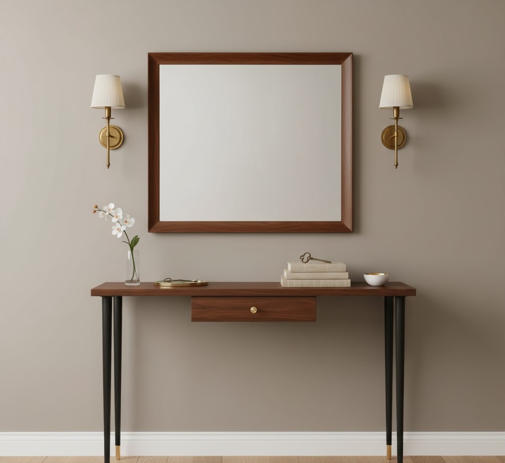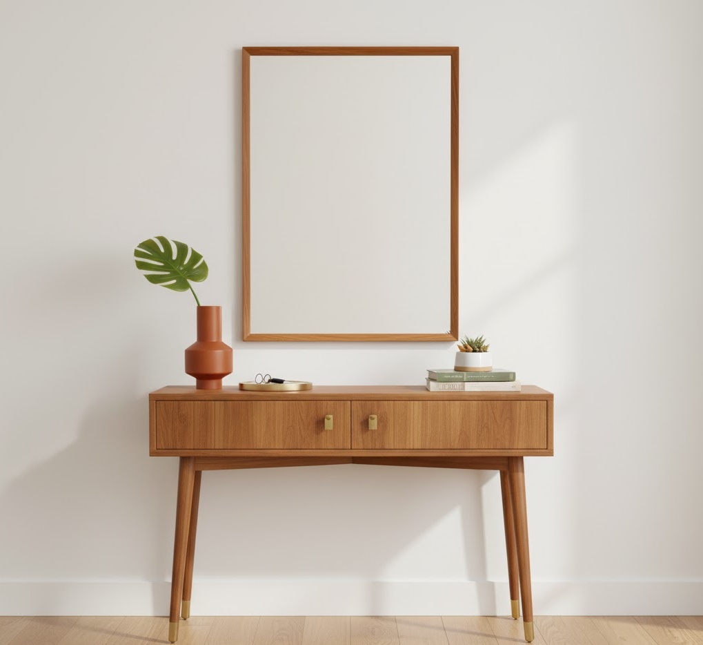 A Mid-Century entryway table offers a timeless blend of retro charm and functional modernism, providing a stylish and inviting welcome to your home. This iconic style is celebrated for its clean lines, organic shapes, and a focus on practical elegance that emerged in the mid-20th century. Typically crafted from warm-toned woods like teak or walnut, often paired with slender tapered legs or subtle brass accents, these tables exude a sophisticated yet approachable aesthetic. The colour palette often features earthy tones, avocado greens, mustard yellows, and oranges, creating a vibrant yet harmonious mood. Functionality is key, with integrated drawers or open shelving designed for efficient organisation without sacrificing visual appeal. The overall mood is one of nostalgic comfort and enduring design, making this entryway table idea perfect for those who appreciate classic design with a touch of vintage flair.