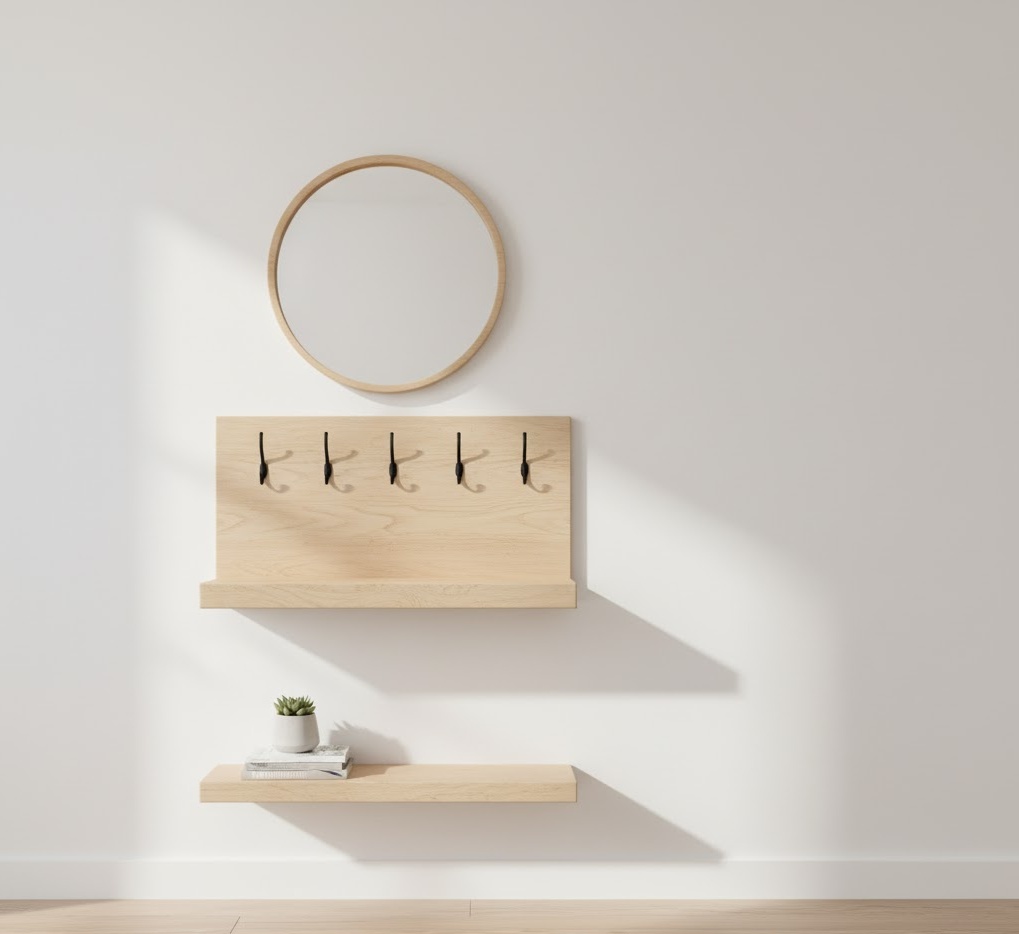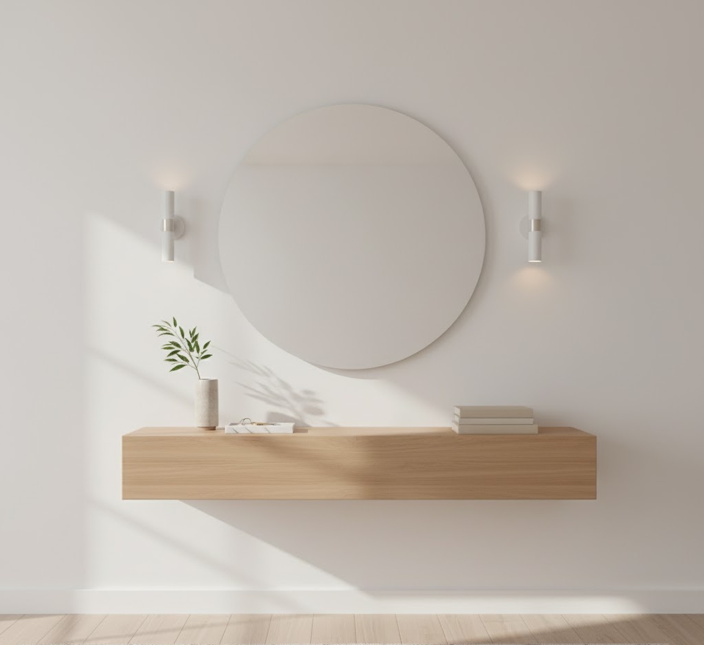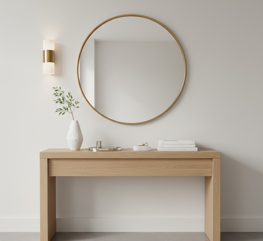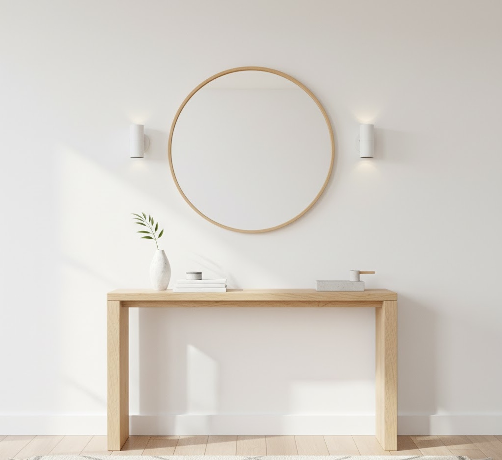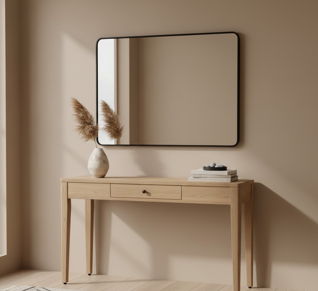 A Japandi entryway table beautifully merges the serene minimalism of Japanese aesthetics with the warm functionality of Scandinavian design, creating a tranquil and harmonious welcome. This sophisticated style is characterised by its clean lines, natural materials, and a profound appreciation for craftsmanship and simplicity. Typically crafted from light-coloured woods like ash or oak, often paired with subtle black accents or natural fibres, these tables exude a calm and uncluttered elegance. The colour palette is predominantly neutral, featuring whites, greys, and natural wood tones, creating a profoundly peaceful and balanced mood. Functionality is understated yet effective, offering a simple surface for essentials or a single, carefully chosen decorative element, maintaining a sense of spaciousness. This entryway table idea is perfect for those seeking a refined, calming, and highly functional entrance that embodies mindful living.