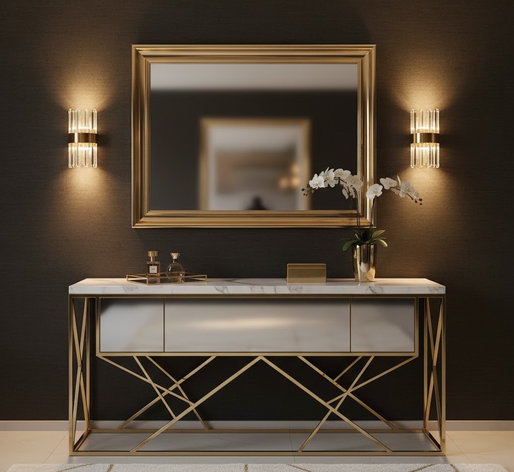 A glamorous luxe entryway table creates an immediate impression of opulence and sophistication, transforming your entrance into a dazzling focal point. This style is all about indulgence, high-shine finishes, and exquisite details that exude luxury. Typically crafted from polished metals like gold or silver, mirrored surfaces, marble, or high-gloss lacquer, these tables are designed to catch the light and command attention. The colour palette is often rich and decadent, featuring metallics, deep jewel tones, crisp whites, and blacks, creating an atmosphere of undeniable grandeur. Functionality often includes a sleek, uncluttered surface for displaying designer accessories or fresh flowers, enhancing the luxurious feel. The mood is one of lavish elegance and refined extravagance, making this entryway table idea perfect for those who desire a truly magnificent and high-end first impression.