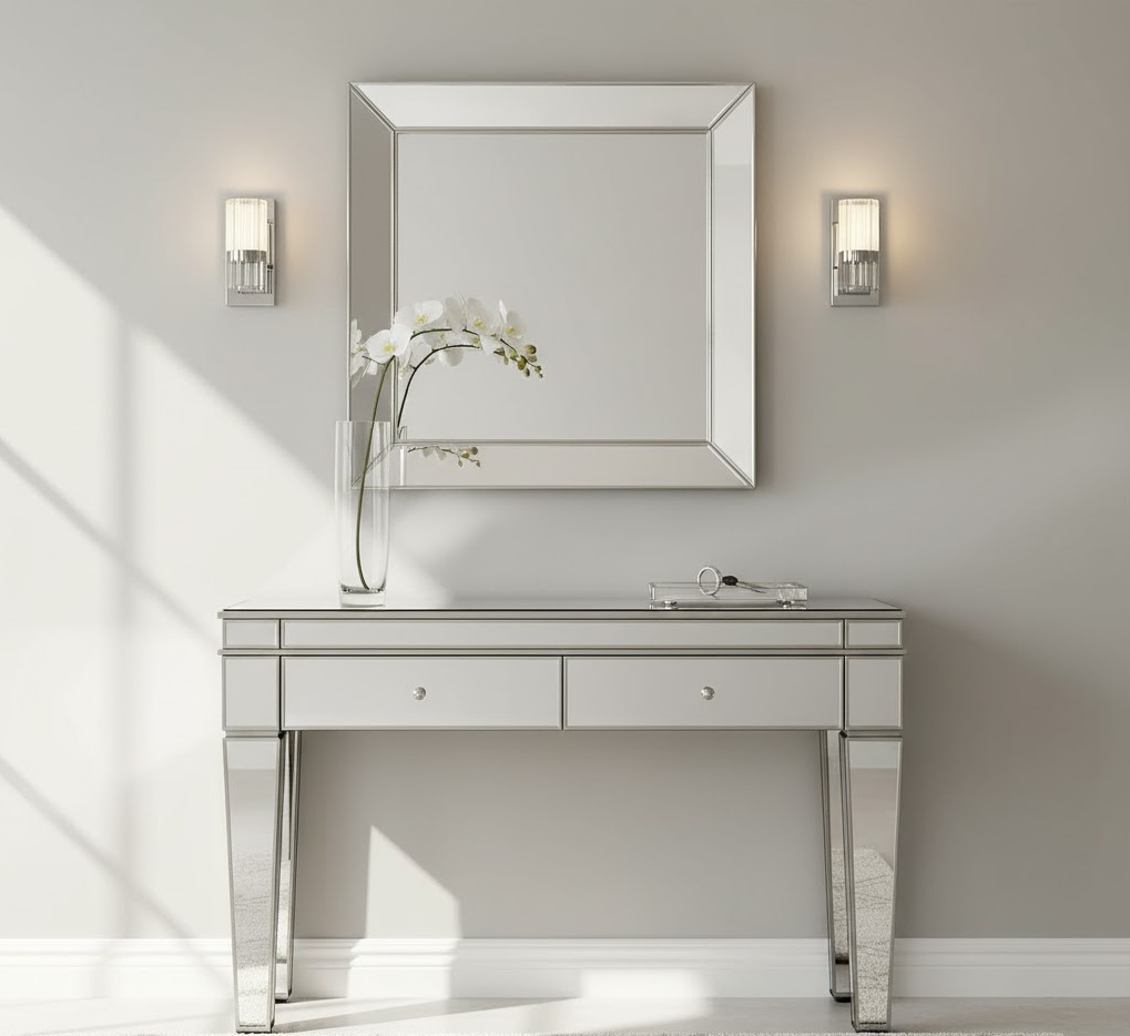 A mirrored entryway table introduces a touch of glamour and expands the perception of space, making your entrance feel brighter and more expansive. This luxurious style is defined by its reflective surfaces, which catch and bounce light, creating a dazzling and sophisticated focal point. Typically crafted with mirrored panels covering all surfaces, often framed with polished chrome or antique gold accents, these tables exude a high-end, opulent aesthetic. The reflective nature means the table adapts to its surroundings, enhancing existing colours and light, creating a dynamic and elegant mood. Functionality is primarily decorative, though the surface provides a chic spot for displaying flowers or a stylish tray. This entryway table idea is perfect for adding a touch of Hollywood Regency flair or for visually enlarging a smaller hallway, ensuring a truly sparkling first impression.