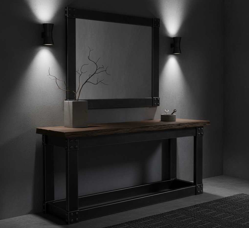 A modern industrial entryway table makes a bold statement, blending raw, utilitarian elements with contemporary design for a striking first impression. This style is characterised by its robust materials and an edgy, urban aesthetic that feels both strong and sophisticated. Typically crafted from a combination of dark metals like black steel or iron, alongside rough-hewn wood, concrete, or even exposed brick accents, these tables exude a powerful, no-nonsense appeal. The colour palette leans towards greys, blacks, and deep browns, often contrasted with the natural tones of wood, creating a dramatic and grounded mood. Functionality often includes open shelving for displaying curated objects or practical storage, reflecting its factory-inspired origins. This entryway table idea is perfect for those seeking a distinctive, modern entrance with an undeniable sense of character and urban chic.