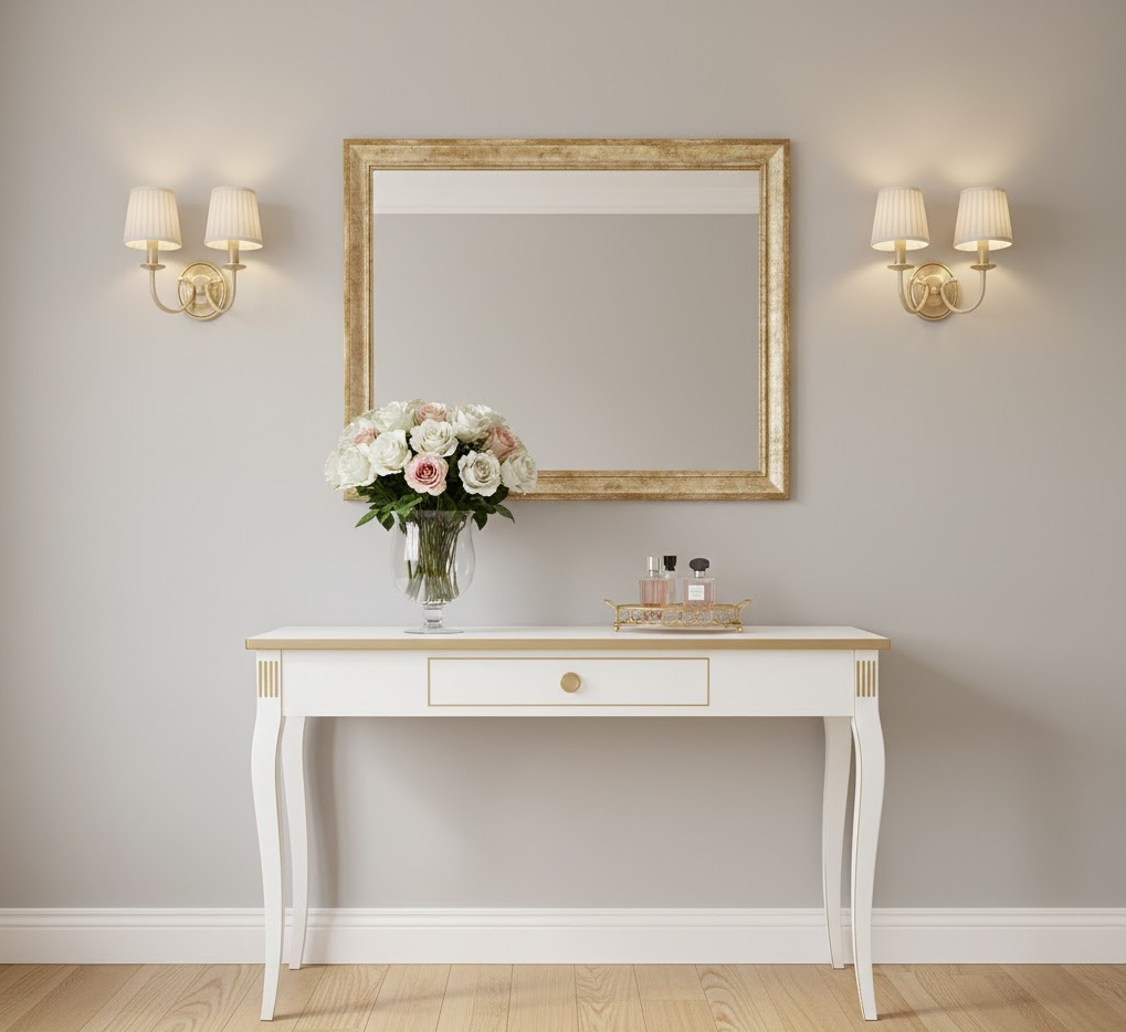 A Parisian chic entryway table evokes the timeless elegance and sophisticated charm of a classic Parisian apartment, offering a refined and romantic welcome. This enchanting style is characterised by its delicate details, graceful curves, and a blend of antique allure with modern sensibility. Typically crafted from painted wood in soft whites or greys, often with subtle distressing, or featuring slender metal frames with glass tops, these tables exude an effortless, understated luxury. The colour palette is typically soft and muted, incorporating pastels, creams, and occasional gold accents, creating a romantic and inviting mood. Functionality often includes a delicate surface for displaying fresh flowers, a small lamp, or a vintage mirror, enhancing the elegant aesthetic. This entryway table idea is perfect for those who desire a touch of French sophistication and a truly charming first impression.