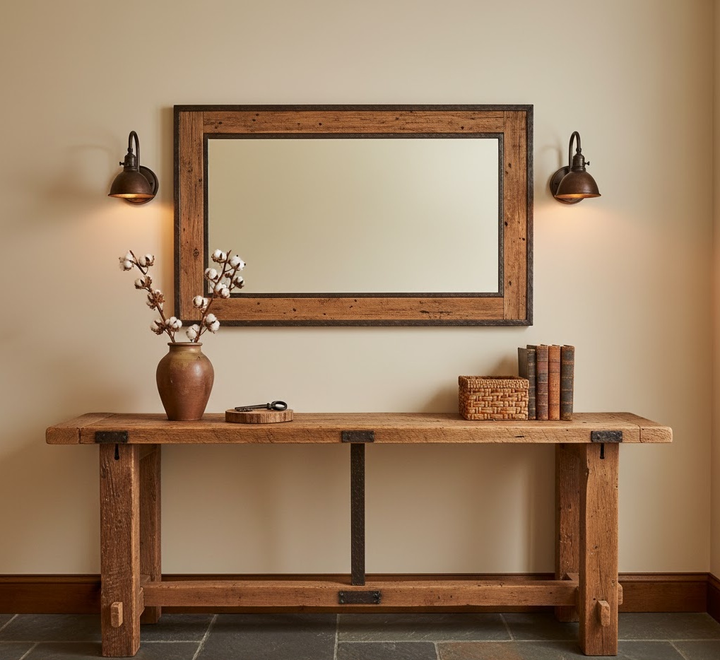 A rustic farmhouse entryway table brings warmth and a welcoming, homely charm to your entrance, evoking a sense of countryside comfort. This style celebrates natural materials and a slightly distressed aesthetic, creating an inviting atmosphere that feels both authentic and lived-in. Typically constructed from reclaimed or solid wood with visible grain and knots, these tables often feature a robust, sturdy build and a warm, earthy colour palette of browns, creams, and muted greens. Functionality is key, with open shelving or drawers perfect for storing baskets, keys, and other everyday essentials, enhancing the practical appeal. The mood is cosy and unpretentious, often complemented by wrought iron accents or vintage-inspired decor, making this entryway table idea ideal for creating a relaxed and genuinely hospitable first impression. It’s about celebrating simplicity and enduring craftsmanship.