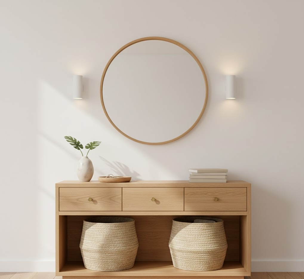 A Scandinavian entryway table embodies simplicity, functionality, and a deep connection to nature, creating a bright and airy welcome to your home. This design philosophy prioritises clean lines, light colours, and natural materials, fostering a calm and harmonious atmosphere. Typically crafted from light-coloured woods such such as birch or ash, often paired with white or pastel accents, these tables exude a fresh and uncluttered aesthetic. The colour palette is predominantly neutral, featuring whites, greys, and soft blues, which enhance natural light and create a sense of spaciousness. Functionality is paramount, with clever storage solutions like drawers or open shelves designed to keep the entrance tidy and organised without sacrificing style. The mood is serene, practical, and inviting, making this entryway table idea ideal for those who appreciate understated elegance and a tranquil, well-ordered home.