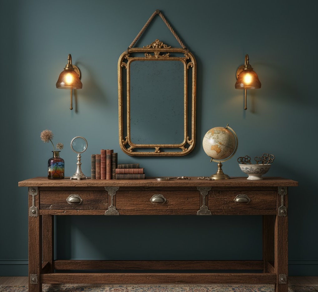 A vintage eclectic entryway table celebrates individuality and storytelling, creating a unique and characterful welcome that feels deeply personal and curated. This distinctive style embraces a mix of eras, textures, and global influences, fostering an atmosphere of artistic charm and unexpected delights. Typically, these tables are antique finds, repurposed pieces, or new items with a distressed finish, often crafted from various woods, metals, or even painted finishes. The colour palette is often rich and varied, combining muted tones with pops of vibrant colour, creating a lively and intriguing mood. Functionality is flexible, serving as a display for collected treasures, family photos, or quirky decorative objects, each telling a part of your home’s story. This entryway table idea is perfect for those who love to blend old with new, creating an entrance that is truly one-of-a-kind.
