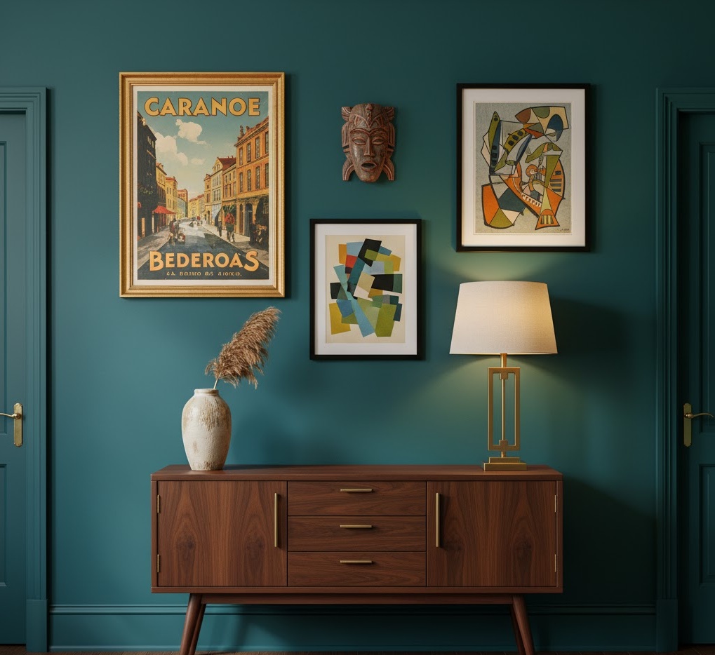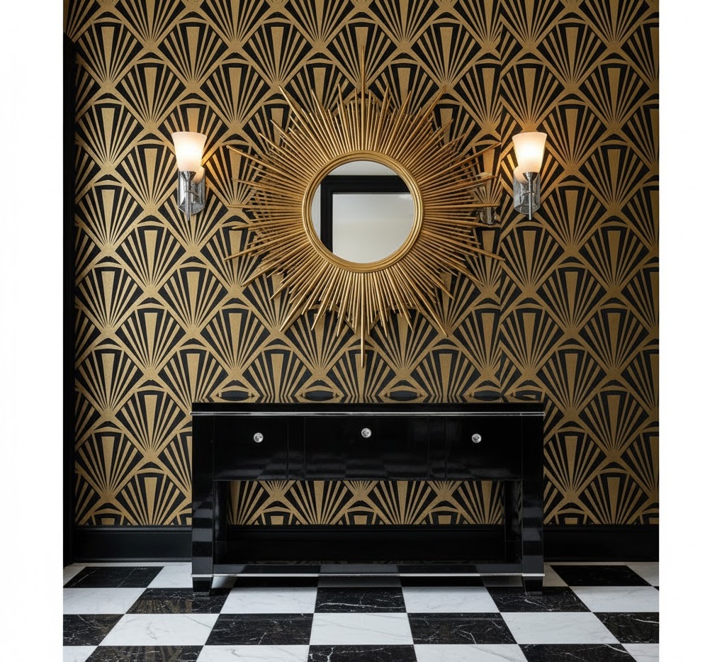 An Art Deco entryway wall style brings a touch of glamour and geometric sophistication, making a bold and luxurious statement. Key materials include polished chrome, mirrored surfaces, lacquered wood, and rich velvet. The colour palette often features deep jewel tones like emerald green, sapphire blue, and ruby red, contrasted with black, gold, and cream. Functionality is elegant, with a sleek console table, a sunburst mirror, and perhaps a small, upholstered stool. This entryway wall idea creates a dramatic, opulent, and stylish mood, perfect for those who appreciate vintage luxury and distinctive design.