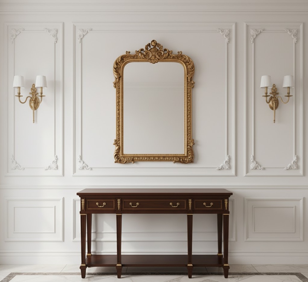 A classic elegant entryway wall exudes timeless sophistication and refined taste, creating a grand and welcoming first impression. Materials often include rich dark woods, polished brass or gold accents, intricate mouldings, and luxurious fabrics. The colour palette typically features deep jewel tones, muted greys, creams, and classic navy, conveying a sense of opulence. Functionality is subtly integrated, with a stately console table, an ornate mirror, and perhaps a velvet upholstered bench. This entryway wall idea cultivates a formal yet inviting mood, perfect for homes that appreciate traditional beauty and enduring style.