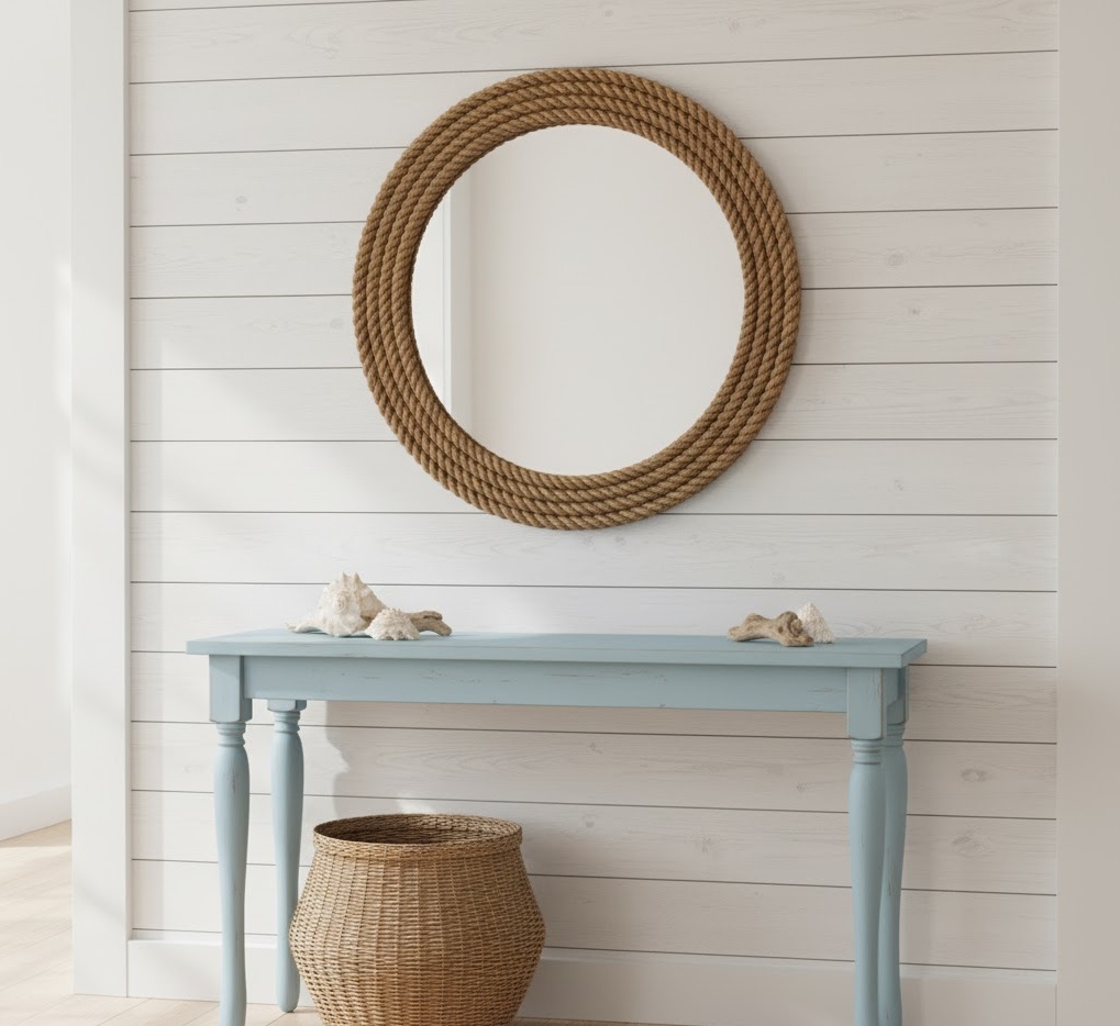 A coastal entryway wall design evokes the serene and refreshing atmosphere of the seaside, bringing a sense of calm and lightness into the home. Materials often include whitewashed wood, natural rope, wicker, and glass, reflecting elements found near the ocean. The colour palette is dominated by crisp whites, soft blues, sandy beiges, and muted greens, creating an airy and bright feel. Functionality might involve a simple bench, woven baskets for beach essentials, and decorative elements like seashells or driftwood. This entryway wall idea creates a relaxed, breezy, and tranquil mood, perfect for a home seeking a perpetual holiday vibe.