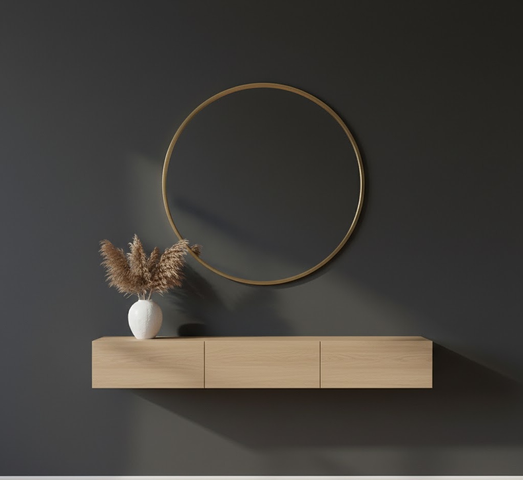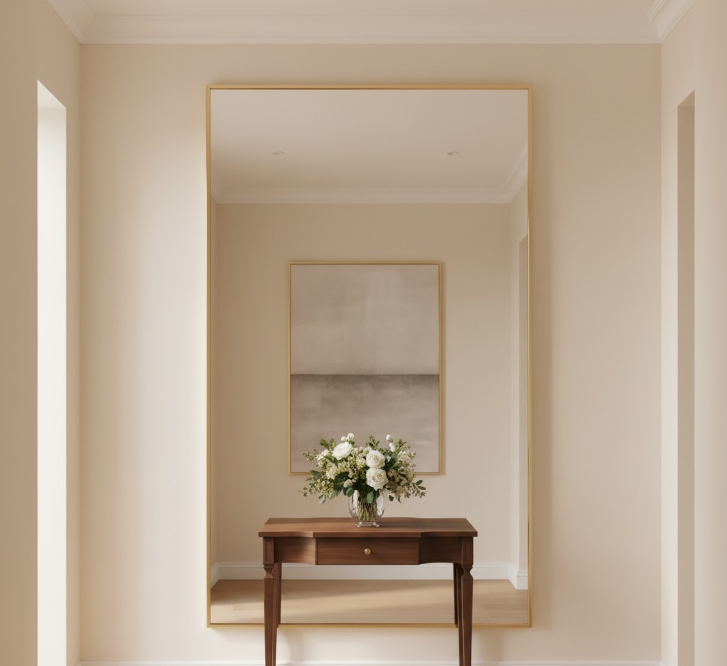 A mirrored entryway wall impact maximises light and creates an illusion of greater space, making even the smallest entrance feel expansive and bright. This design can feature a single oversized mirror, a collection of smaller mirrors, or even mirrored wall panels. The materials are primarily glass, often framed with metal (gold, silver, black) or wood, complementing various interior styles. The colour palette is reflected from the surrounding space, enhancing its existing tones. Functionality is inherent in its reflective quality, offering a last-minute check before leaving. This entryway wall idea creates a luminous, elegant, and spacious mood.