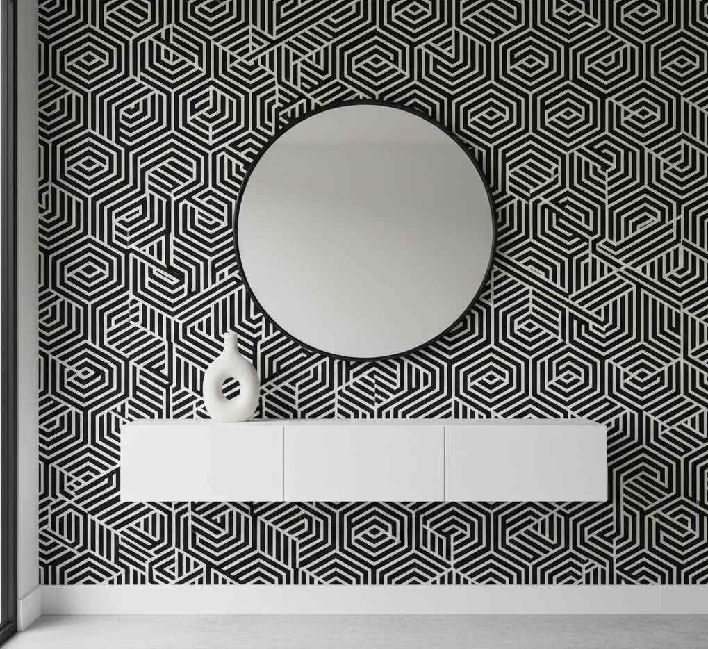 A geometric pattern entryway wall makes a striking visual impact, adding dynamism and contemporary flair to the entrance. This style often uses wallpaper, painted murals, or tiled surfaces featuring bold shapes, lines, and repeating motifs. The colour palette can range from monochromatic and subtle to vibrant and contrasting, depending on the desired effect. Functionality is often kept simple to let the pattern be the focal point, perhaps with a minimalist floating shelf or a discreet bench. This entryway wall idea creates an energetic, modern, and sophisticated mood, perfect for making a memorable first impression.