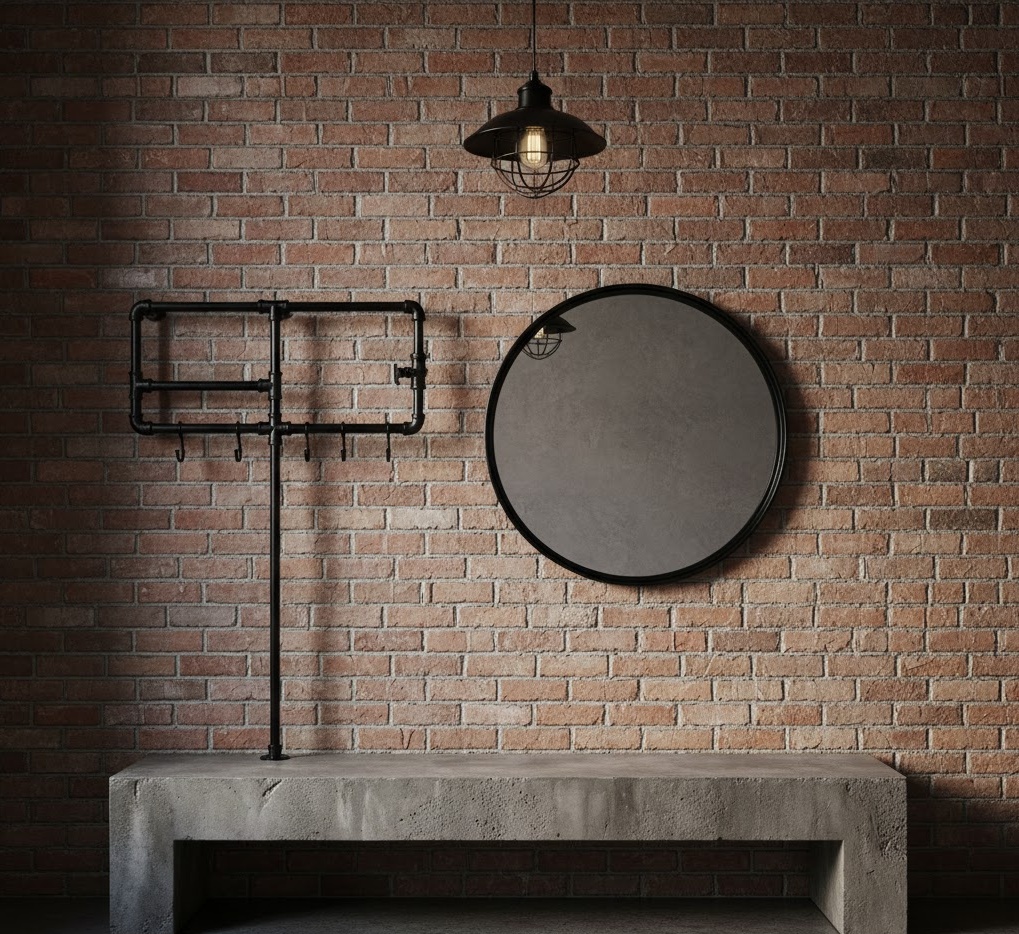 An industrial entryway wall embraces raw, utilitarian aesthetics, celebrating exposed materials and robust forms. This style prominently features materials like exposed brick, concrete, distressed wood, and black metal accents. The colour palette is typically monochromatic, with shades of grey, black, and white, often complemented by the warm tones of natural wood or rust. Functionality is straightforward and durable, incorporating elements such as metal shelving units, pipe-style coat racks, and sturdy benches. This entryway wall idea creates a bold, urban, and edgy mood, perfect for modern city dwellings or loft apartments seeking a strong character.