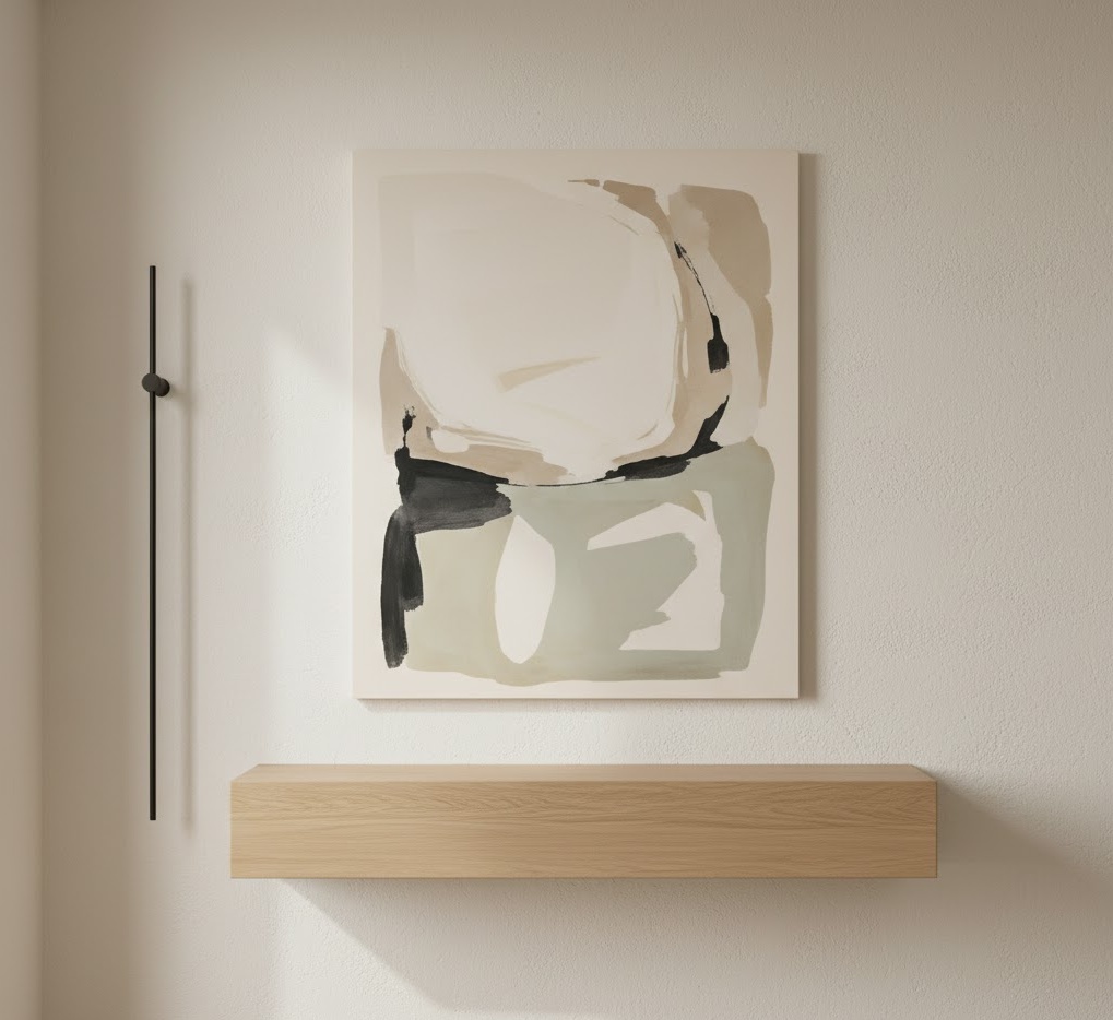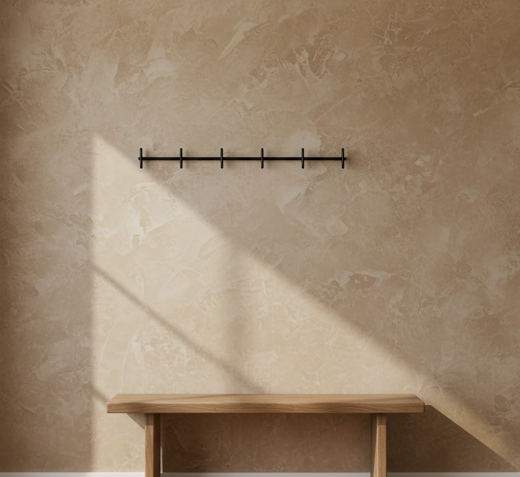 A textured plaster entryway wall adds tactile interest and a bespoke, artisanal feel to the entrance. This style uses techniques like Venetian plaster, limewash, or rough stucco to create a unique, organic surface. The materials are primarily plaster-based, often in natural, earthy tones or subtle pastels, allowing the texture to be the star. The colour palette is typically muted, featuring creams, greys, soft greens, or warm beiges, enhancing the depth and movement of the surface. Functionality is often minimalist, letting the wall itself be the artwork. This entryway wall idea creates a sophisticated, earthy, and calming mood.