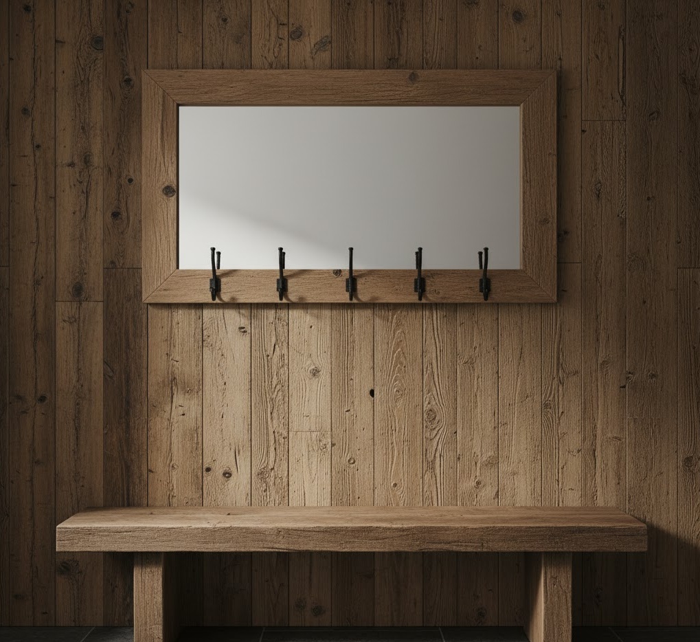 A rustic wood entryway feature celebrates the natural beauty and warmth of timber, creating a cosy and grounded welcome. This style heavily relies on reclaimed wood, distressed finishes, and visible grain patterns, often paired with wrought iron or stone accents. The colour palette is earthy, dominated by various shades of brown, natural wood tones, and deep greens or charcoals. Functionality is robust and practical, with a sturdy wooden bench, heavy-duty hooks, and perhaps a large wooden storage chest. This entryway wall idea evokes a sense of history and comfort, perfect for country homes or those seeking a connection to nature.